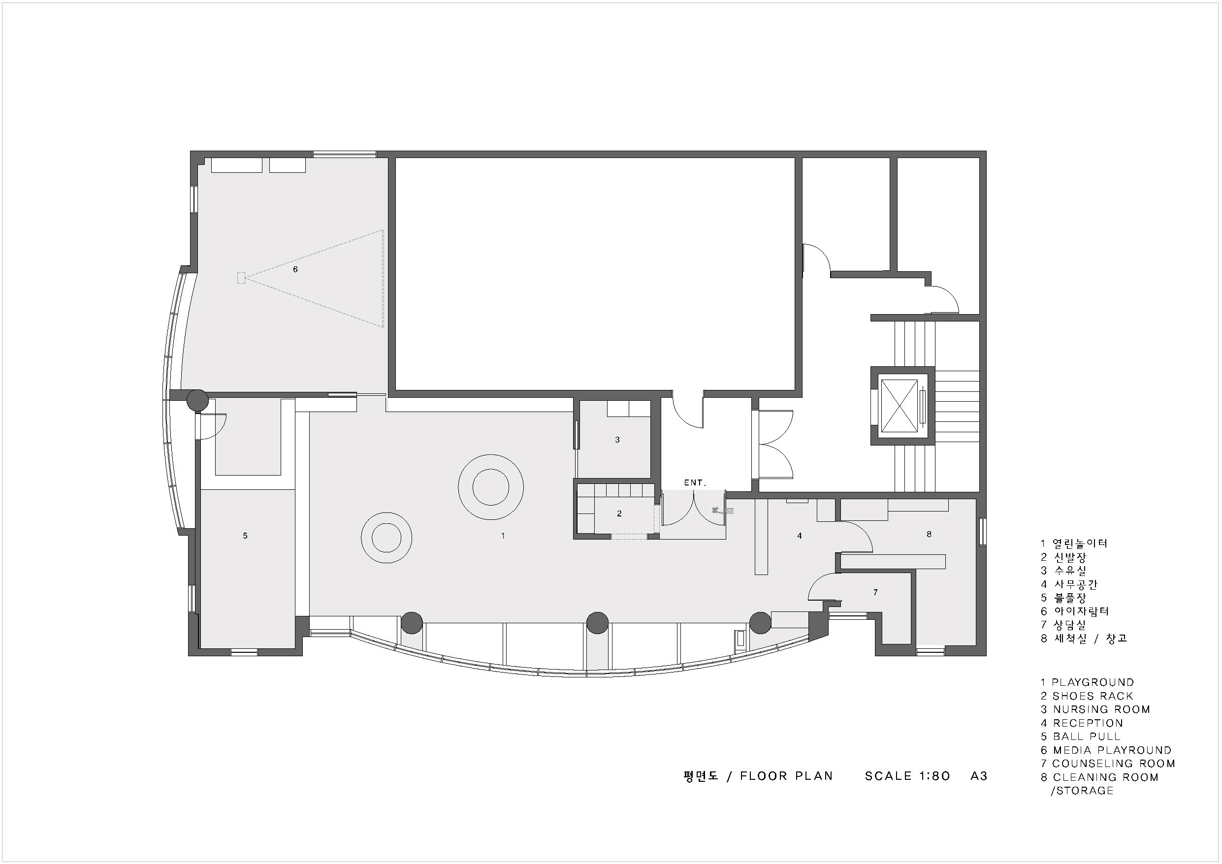 공공에서 운영하는 영유아들이 놀 수 있는 공간이다. 요즘 아이들은 공간을 사용하는데 비용을 지불하며 공간을 소비한다. 어린이들은 학원에 비용을 지불해 친구를 만나 공부를 하고, 청소년들은 카페에서 비용을 내고 머무른다. 어린이, 청소년뿐만 아니라 영유아도 비용을 지불하고 키즈카페나 놀이공원에서 놀 수 있다. 이렇게 공간을 소비하는 세상에서 경제적인 여건이 어려운 사람들은 공부를 하거나 노는 것조차 공간의 사용이 자유롭지 않다. 그래서 공공에서 운영하는 영유아들이 공간의 소비가 아닌 자유로운 공간의 활용이 필요하다. 공공에서 운영하는 영유아를 위한 공간은 기존의 키즈카페의 특별한 놀이시설의 설치보다 프로그램의 변화에 따른 유동적인 운영이 가능해야 했다. 무엇보다 아이들이 자기만의 집에 와서 편안히 놀 수 있는 집과 같은 공간이 되길 바랬다. 작은 아이들의 시선에 맞는 크기의 작은 집들의 구성이고, 각각의 집에는 다른 종류의 놀이로 채워질 것이다. 장난꾸러기들이 자기만의 집에서 장난스럽게 놀 수 있는 공간이다.