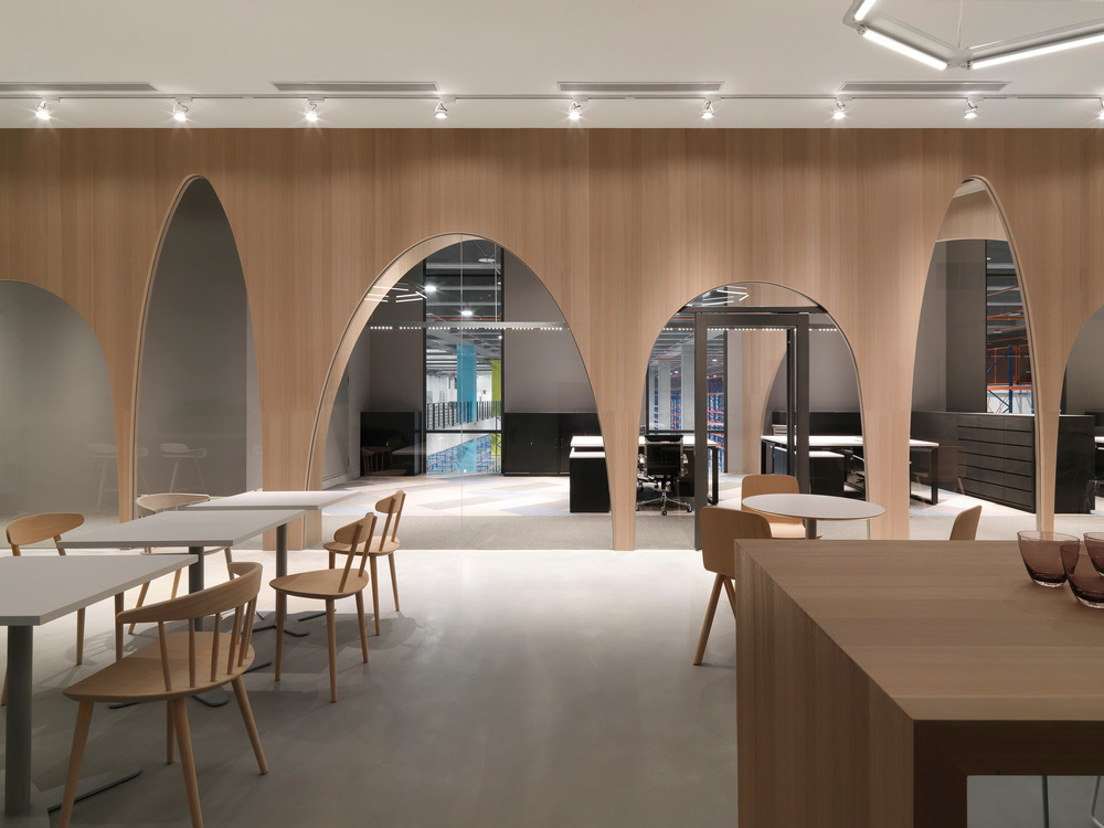기둥의 폭이 크고 천장이 높아 주변 산의 아름다운 경관과 나란히 있어 개방성의 아이디어를 탐구하기로했다. 건축가는 내부와 외부 사이에 창의성, 개인화, 협력을 촉진하는 장소를 만들었다. 아치 디자인은 안뜰의 개념에서 영감을 받아 다양한 높이와 너비로 프레임을 구성하여 집결이라는 아이디어에 완벽하게 조화를 이룬다. 워크스테이션은 아치로 둘러싸인 홀인 클로스터 영역에 배치되어 한쪽은 내부 건물을 향하고 다른 한쪽은 안뜰을 내려다보는 배치이다. 뜰은 밝고 야외광장으로 개방되어 있으며, 나무 아케이드와 여러 개의 출입구로 둘러싸여 있어 워크스테이션과 안뜰을 연결한다. 전형적인 사무실의 위계질서를 해체하기 위해 작은 그룹과 호흡 공간을 가진 휴먼 스케일의 접근방식으로 레이아웃을 만들었다.