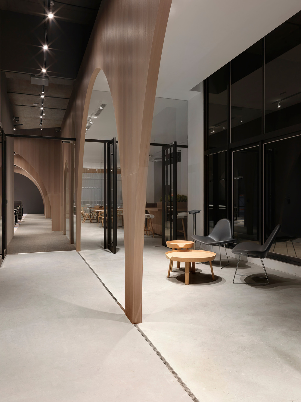 Given the large column span and high ceilings of the site, juxtaposing with the beautiful views of the surrounding mountains, they decided to explore the idea of Openness. J.C. Architecture created a place that promotes creativity, personalization and collaboration while playing a role between the interior and exterior. The arches design is inspired by the concept of the courtyard, framing them with different heights and widths to perfectly accommodate with the idea of gathering. The workstations are placed in what is called the “cloister area,” a hall enclosed by arches with one side facing the inner building and the other overlooking the courtyard. The courtyard is bright and opens as an outdoor plaza, and surrounded by the wooden arcade and its multiple doorways, linking the workstations and courtyard together. They created the layout in a human-scale approach with small groups and breathing spaces, as it dissolves the hierarchy of a typical office.