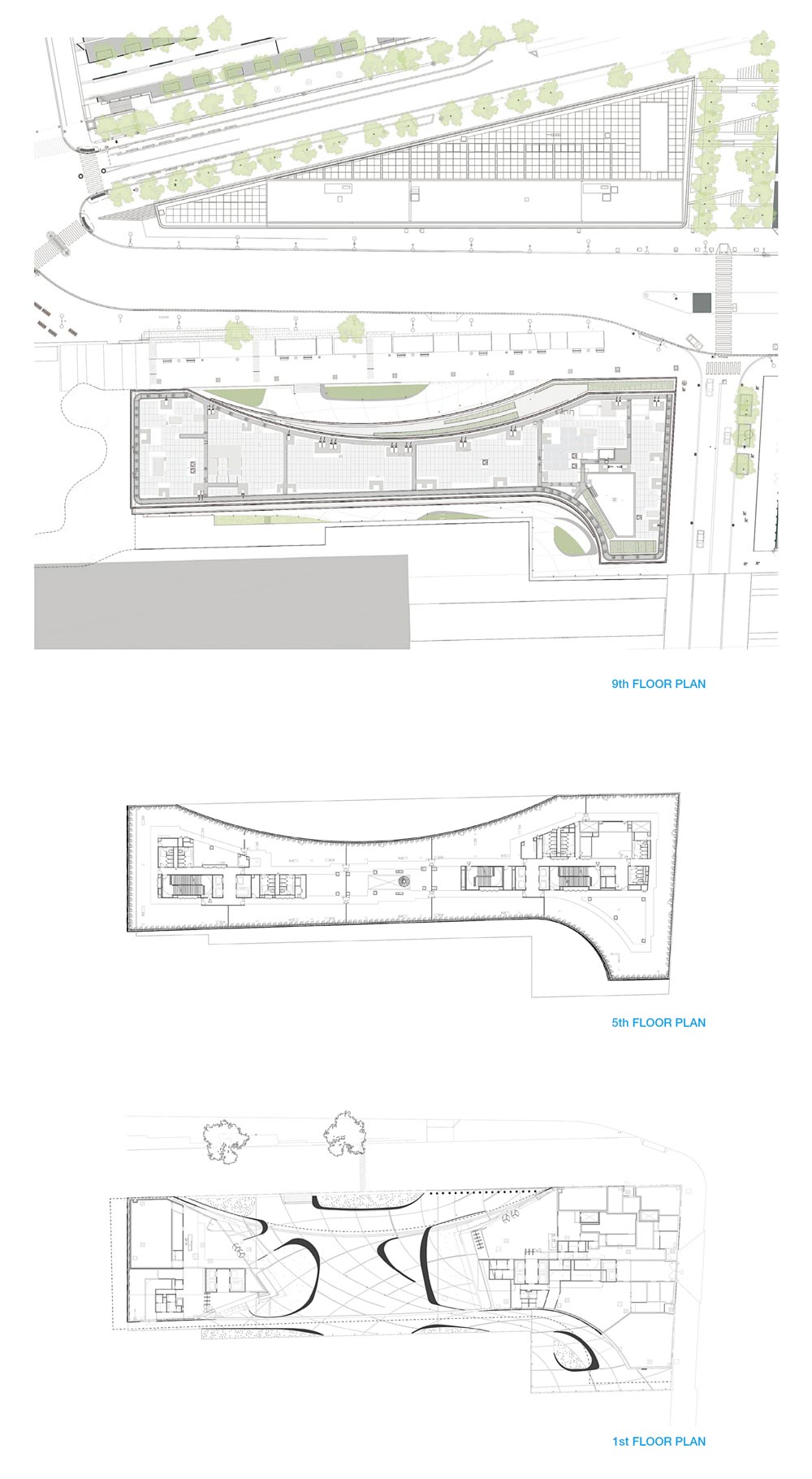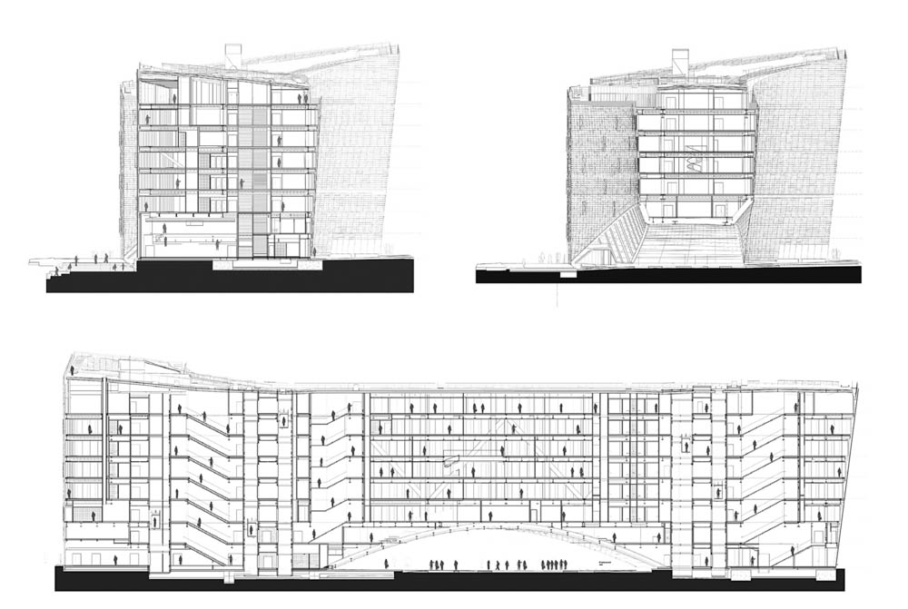 Sitting adjacent to the historic Gare d’Austerlitz train station, the project is a close neighbor to the historic Latin Quarter and the lushly planted gardens of the Jardin des Plantes. The concave form of the building bridges over the below-grade railyard, anchored on both sides with two seven-story cantilevering volumes held together by a complex network of steel. Three gestural «cuts» shape the building mass: the «sky cut» reveals the oblique surface of the solar-panel-clad roof; the «city cut» pulls the building back from the along its street-facing facade; and the «ground cut» carves out the underside of the bridging structure, enveloping the new public plaza together beneath its expansive arched form.