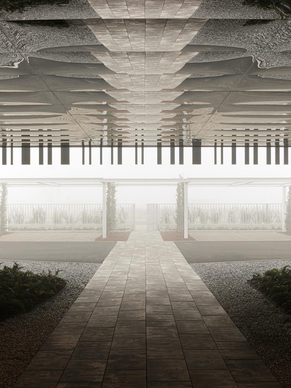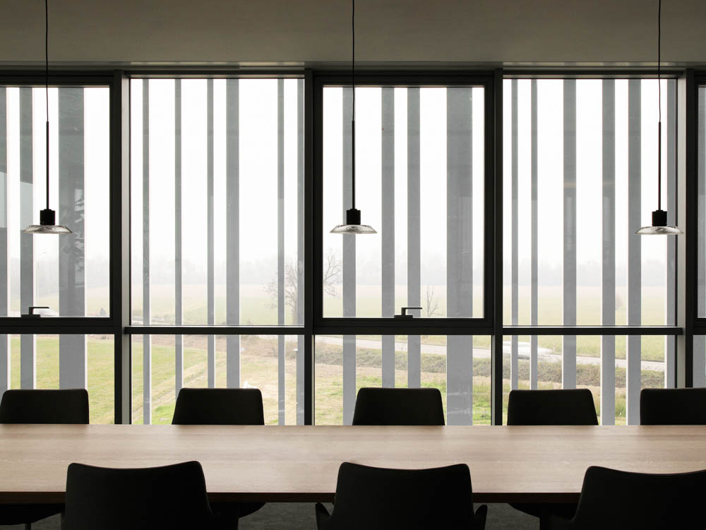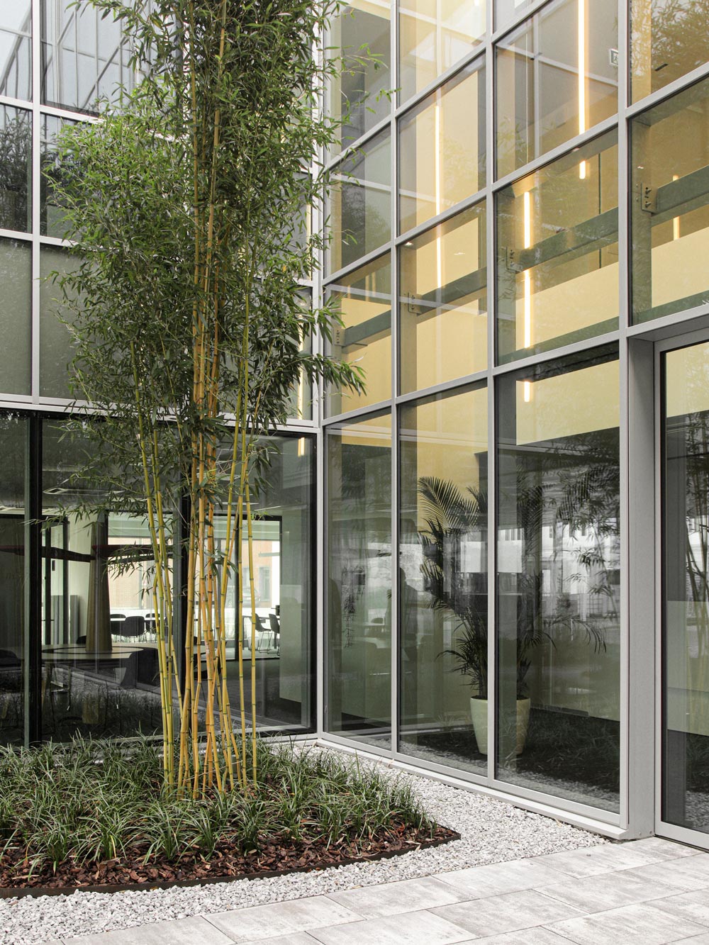 The office building has been “hollowed out” in the middle to obtain a glazed patio around which the interior spaces are arranged. On the ground floor, the courtyard welcomes visitors. The vertical distribution system with stairs and suspended walkways increases the sense of lightness and brightness. On the outside, the entire ground floor is glazed, which visually detaches the other two floors from the ground. The latter are characterized by a glass façade screened by a protruding metal sunshade that creates a new volume, defined by a pattern that almost dematerializes the building. The interiors of the offices are designed as open-space, where workstations are interspersed with communal areas, zones for collaboration, phone booths, meeting rooms and relaxation lounges, with the aim of creating a dynamic and collaborative environment.