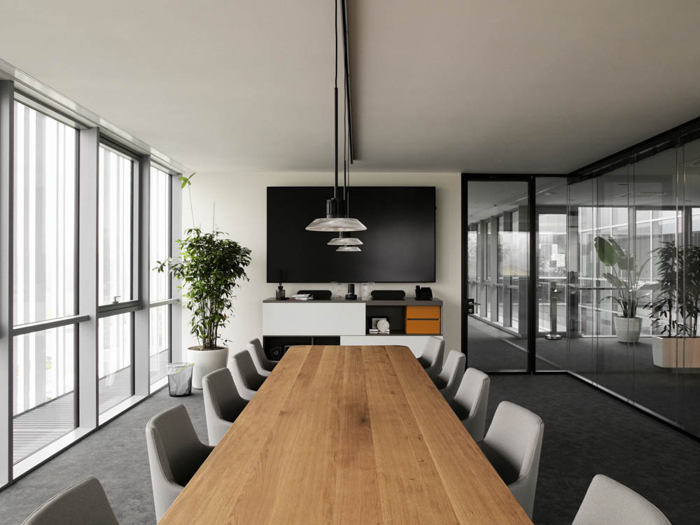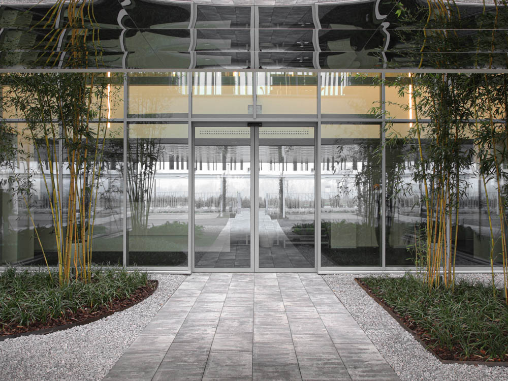 The office building has been “hollowed out” in the middle to obtain a glazed patio around which the interior spaces are arranged. On the ground floor, the courtyard welcomes visitors. The vertical distribution system with stairs and suspended walkways increases the sense of lightness and brightness. On the outside, the entire ground floor is glazed, which visually detaches the other two floors from the ground. The latter are characterized by a glass façade screened by a protruding metal sunshade that creates a new volume, defined by a pattern that almost dematerializes the building. The interiors of the offices are designed as open-space, where workstations are interspersed with communal areas, zones for collaboration, phone booths, meeting rooms and relaxation lounges, with the aim of creating a dynamic and collaborative environment.