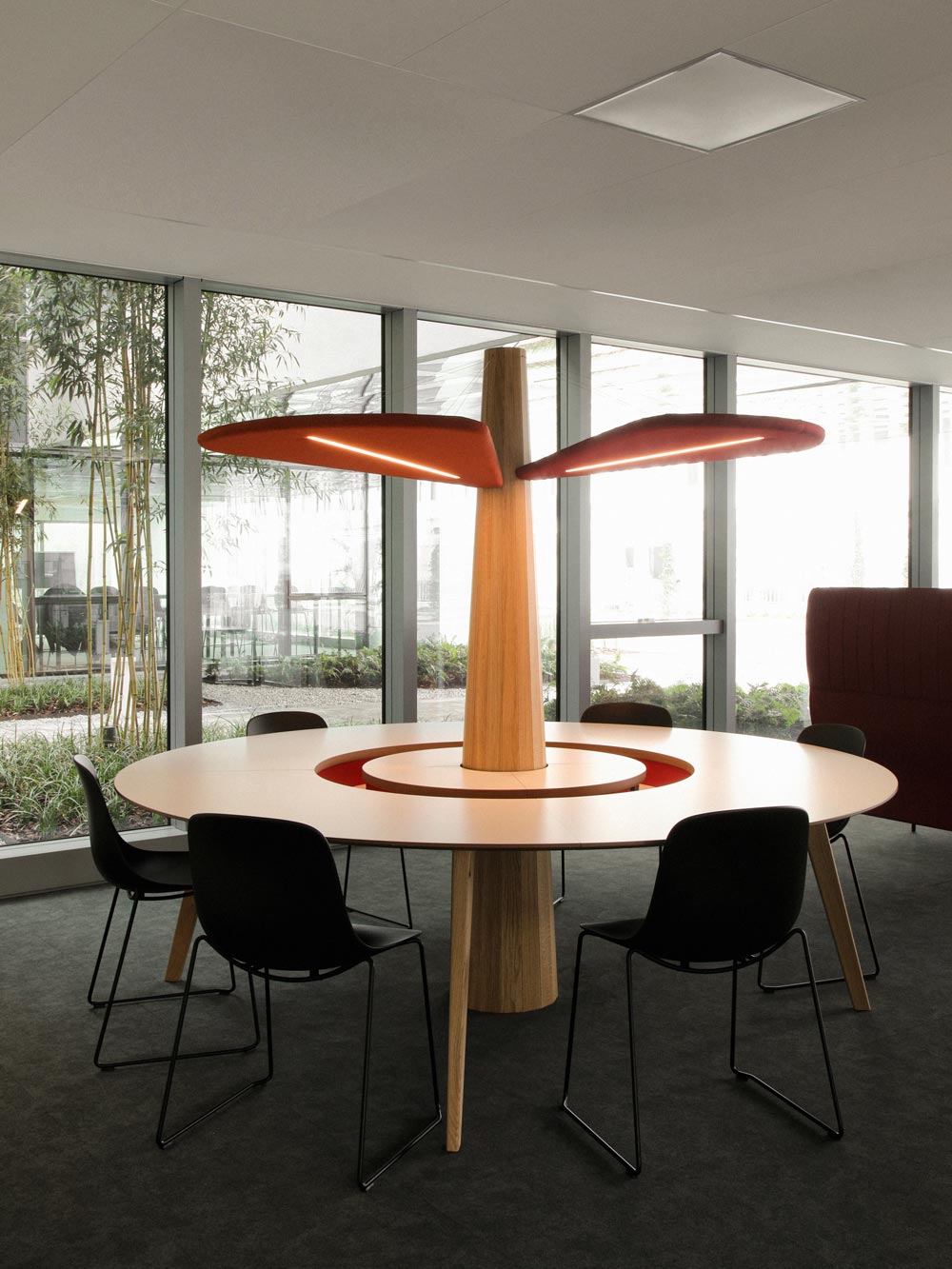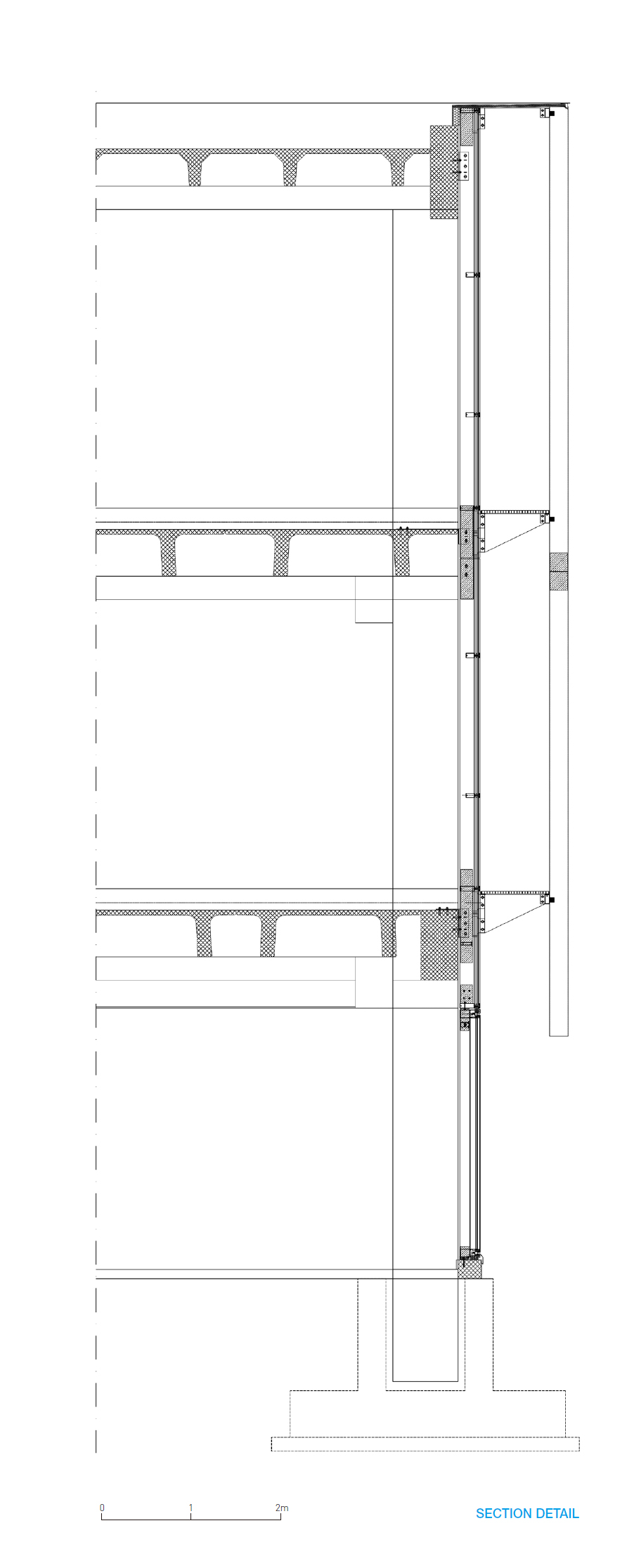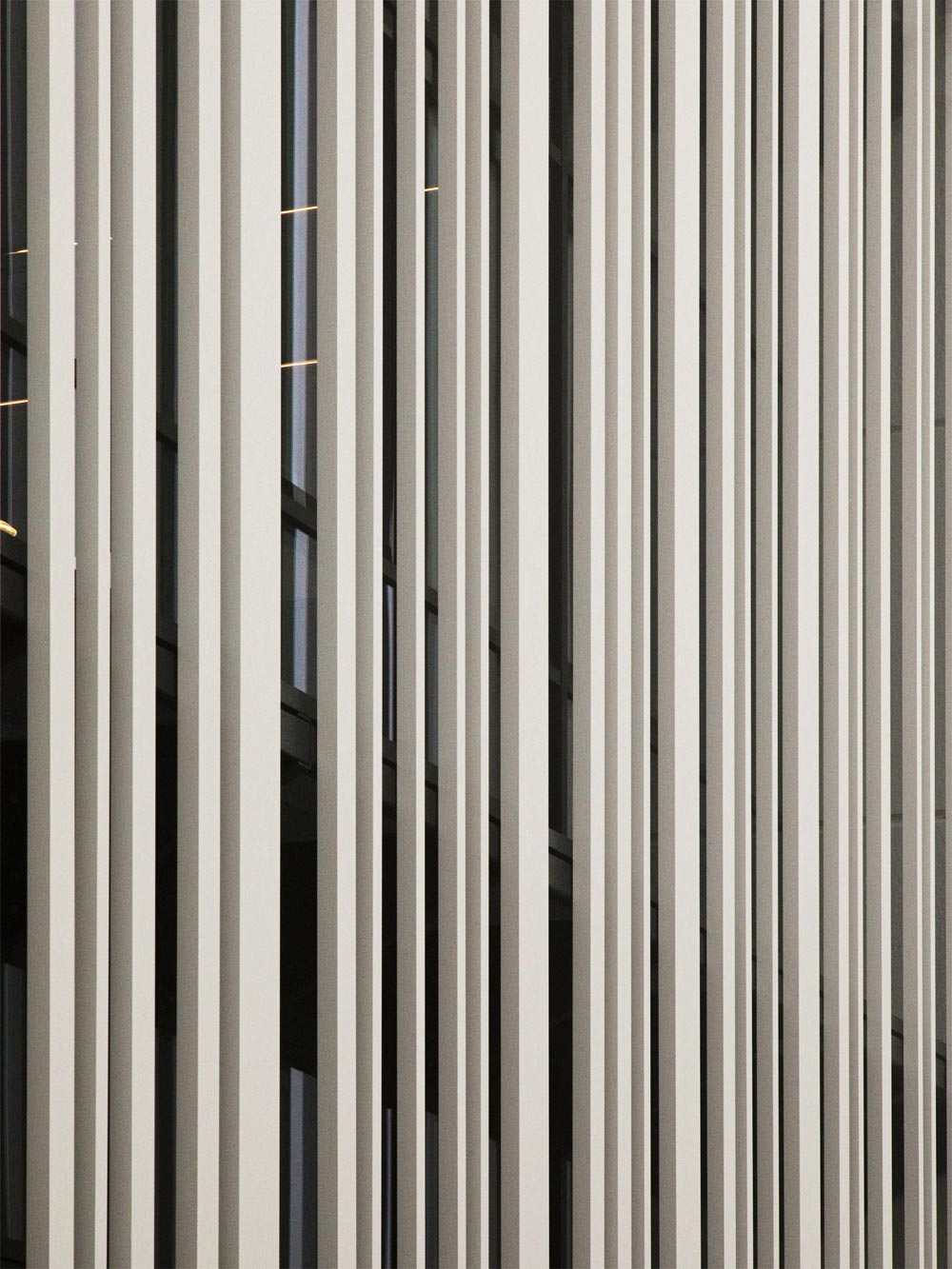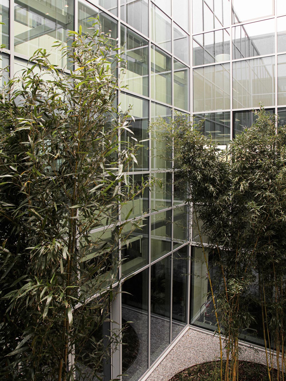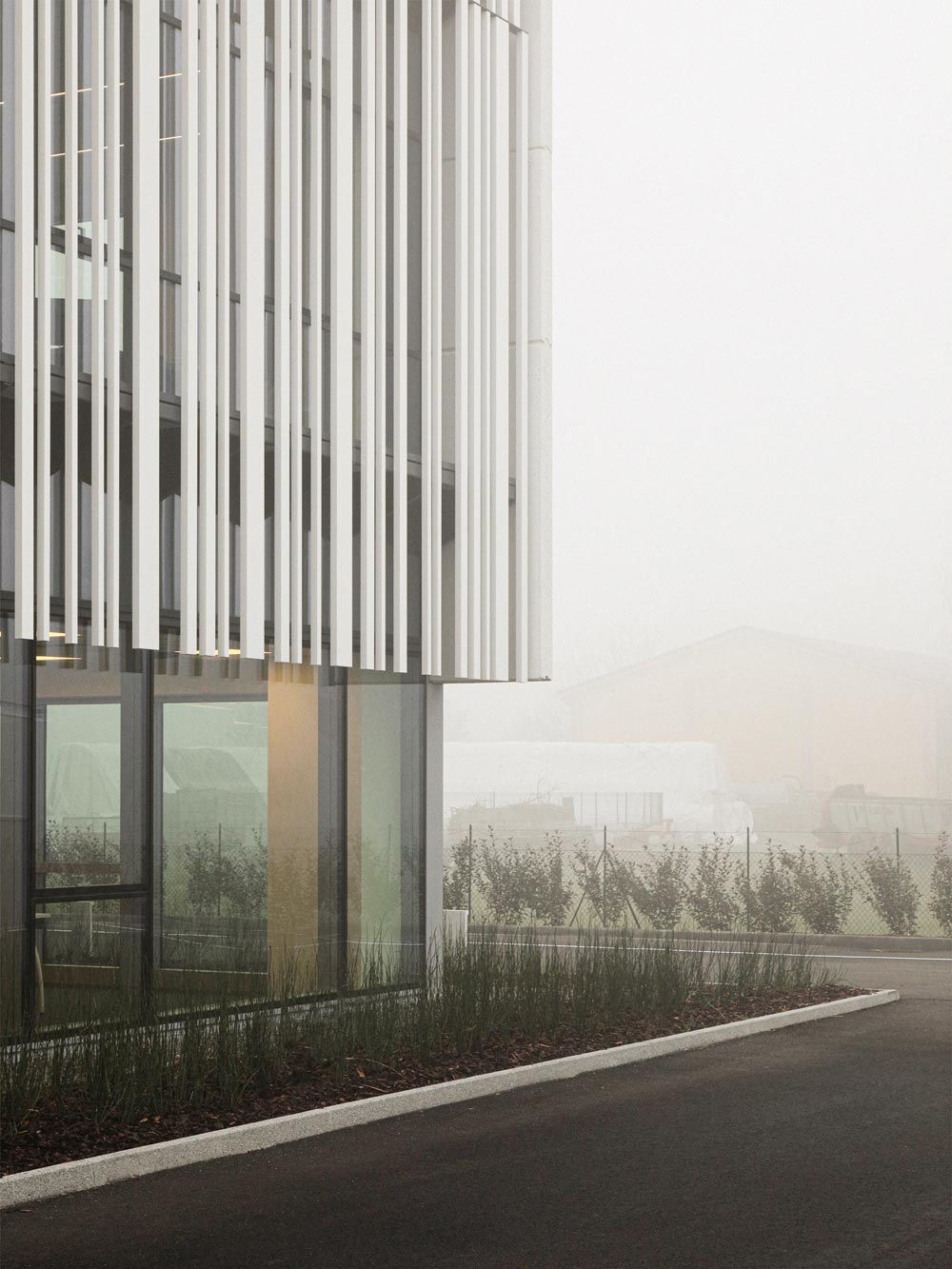 사무동은 내부 공간의 유리 파티오를 둘러싼 형태를 얻기 위해 중간이 비어있다. 1층에는 안뜰이 방문객을 맞이한다. 계단과 매달린 통로가 있는 수직 분배 시스템은 공간을 가볍고 밝게 만들어준다. 외부에는 1층 전체가 유리로 되어 있어 다른 2개 층을 시각적으로 분리한다. 새로운 매스를 생성하는 튀어나온 금속 차양으로 가려진 유리 파사드가 특징이며, 매스는 건물을 비물질화하는 듯한 패턴이 특징적이다. 사무실 내부는 워크스테이션이 공동 공간, 협업 구역, 전화 부스, 회의실 및 휴게실이 사이사이에 배치된 개방형 공간으로 설계되어 역동적이고 협업할 수 있는 환경을 조성한다.