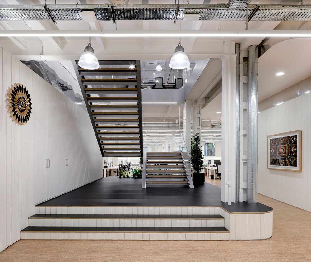 이 프로젝트는 상층 슬래브를 열고 넓은 계단을 통해 1층과 지상층을 연결하는 것으로 마무리됐다. 새로운 계단은 그 자체로 만남의 장소가 되어 회사의 모든 업무와 회의 공간이 중심이 된다. 단순한 기능을 넘어 그 치수를 넓히고 늘림으로써 상부 슬래브에 매달려 있는 곡선형 금속 구조가 회의 플랫폼으로 인식된다. 넓은 층계참은 만남의 장소이자 내부적 관점의 역할을 한다. 그것은 주변 환경으로부터 독립되는 높은 플랫폼에서 시작하여 관계와 만남을 위한 공간 역할을 한다.