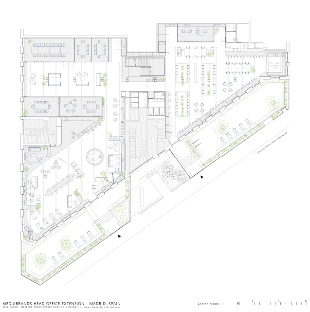 The company previously operated out of the first floor of Madrid's Regle building. The project entails not only an extension and integration with the ground floor, but also the creation of a patently spacious, light-flooded, fluid, and flexible, multifunctional space with an outdoor connection. This space was designed to stimulate communication and exchange through an architectural layout that allows for multiple situations simultaneously, and with different seating capacities; from small groups in meetings located in pleasant corners, to large events in which the entire lobby is connected via videoconferencing through LED screens and large-scale projectors. A massive motorised table can be raised to transform the space, while a curved curtain serves to subtly subdivide the foyer for large events calling for a degree of privacy.