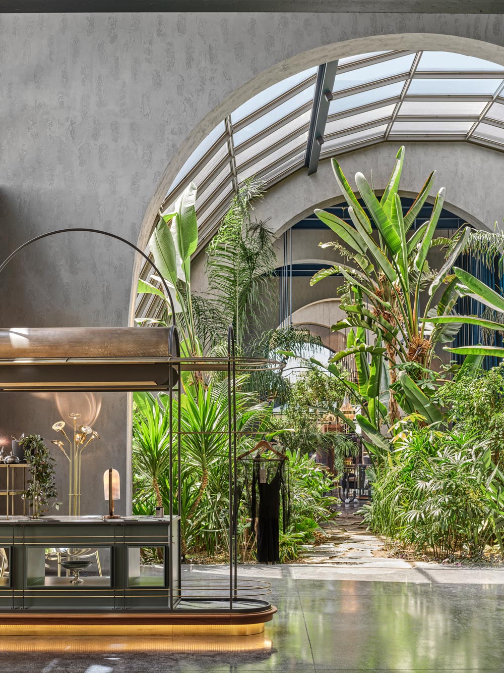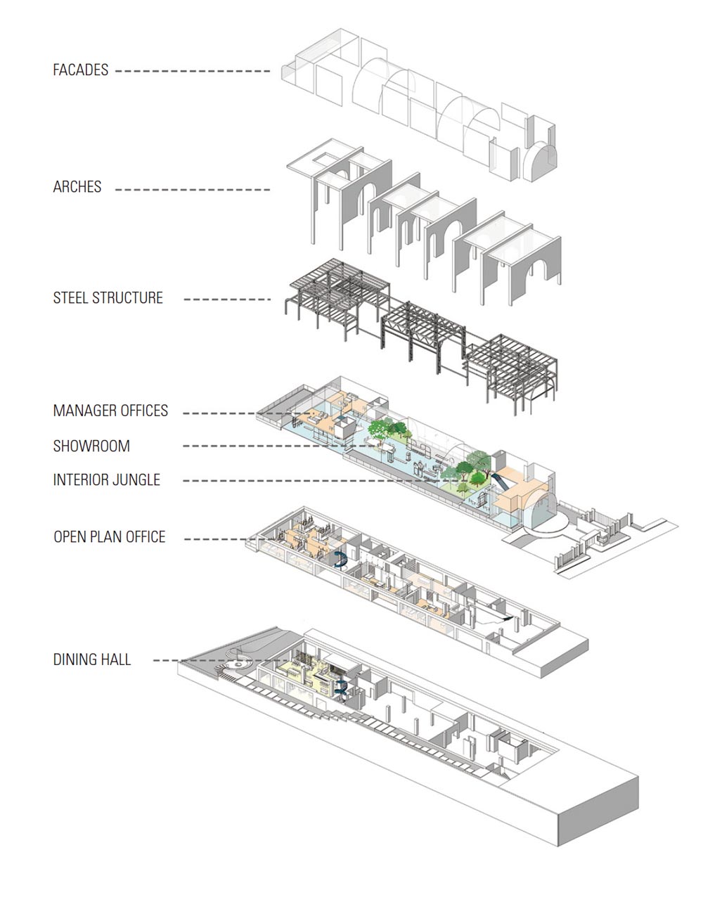 건물의 초입 구역은 정글과 같은 살아있는 자연의 분위기를 통해 고객들을 맞이한다. 방문객들은 둥근 유리 천장 아래의 자연 공간을 지나가면서 업무 공간과 라운지가 있는 쇼룸에 다다른다. 두 번째 둥근 천장 구역은 쇼룸을 두 개로 분할하며, 거대한 미팅 공간을 제공한다. 마지막으로 인테리어 라운지와 호수 전망을 향한 테라스로 여정이 마무리된다.