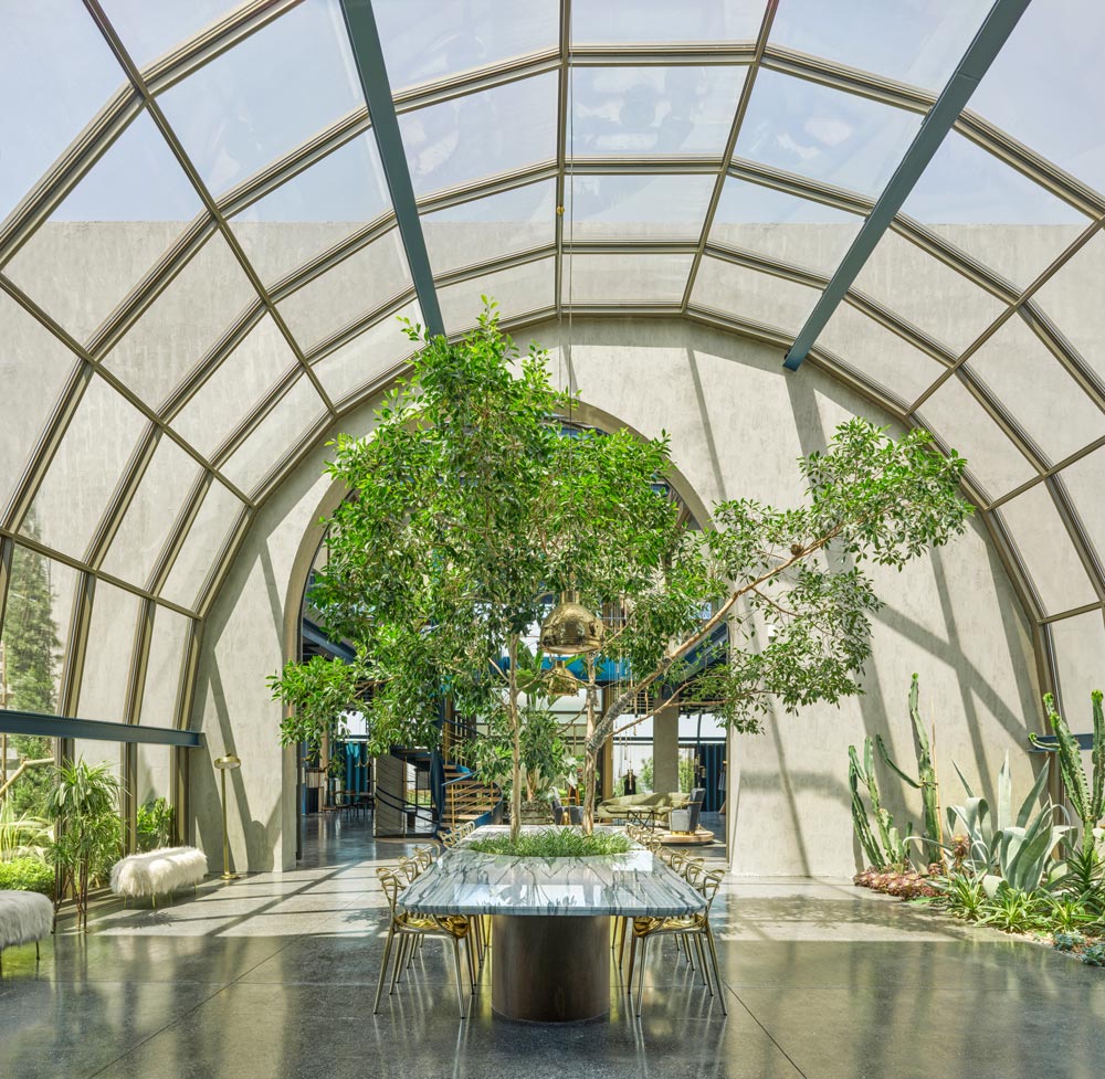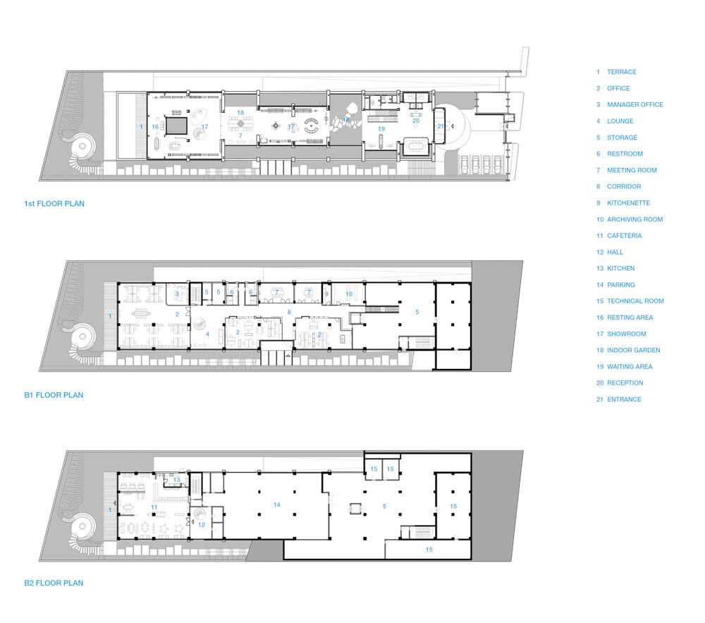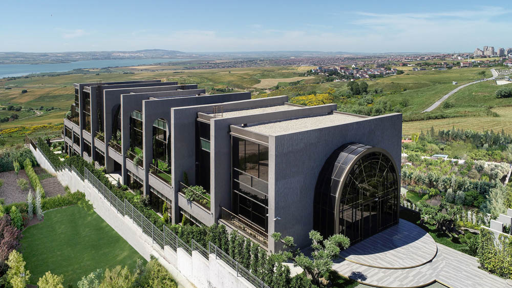 The preliminary sections from the entrance of the building welcome the guests and surround them with a living nature atmosphere like a jungle under the glass vault. Therefore, the guests passing by the plants, reach the showroom which accommodates the working space and lounge. The second glass vaulted section divides the showroom into two and also provides a large meeting space. Eventually, the journey finishes with an interior lounge and a terrace that overlooks the lakeside view.