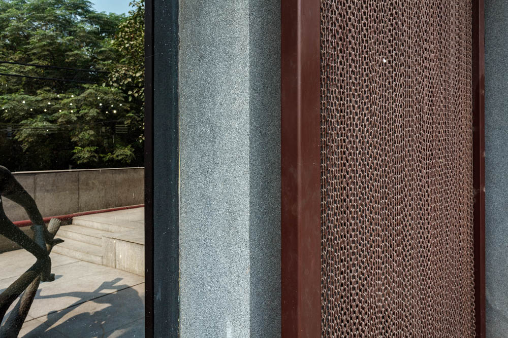 Instead of hiding under a veil of glass and granite, the design aims to make a post-industrial statement that would intrigue the visitor. Okhla is equated to a war zone, and in response, a metal shell envelops the structure to protect the interiors from the hostile and acrid environment. An inward-looking building, therefore, finds its justification in the site’s industrial skyline that offers nothing of visual interest at eye level. The poor air quality and ruckus created by the monkeys in the neighbourhood prevented large openings on the facade. But a visual connection to the outside has been maintained using controlled apertures crafted in corten steel. The jaali screen allows minimal daylight to penetrate within and prevents monkeys from entering the premises.
