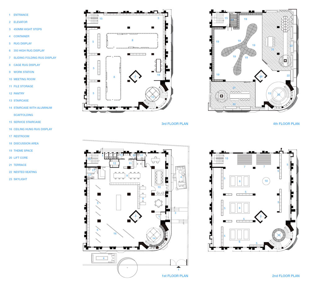 러그 리퍼블릭은 인도 최대의 러그 및 소프트 가구 수출 업체 중 하나로, 브랜드의 정교한 작업을 기념하기 위해 거슬리지 않는 배경이 되도록 단단한 껍데기를 만드는 것이 설계 핵심이었다. 드러난 블랙 인테리어, 철근 케이지 등 저가 재료를 통한 전시공간 계획은 공간에 미완성의 미를 더한다. 또한, 임시적인 개입을 사용하여 내부 레이아웃에 어느 정도의 유연성이 추가되었다. 바닥에는 향후 변경 시 쉽게 제거할 수 있도록 내화 벽돌을 깔았다.