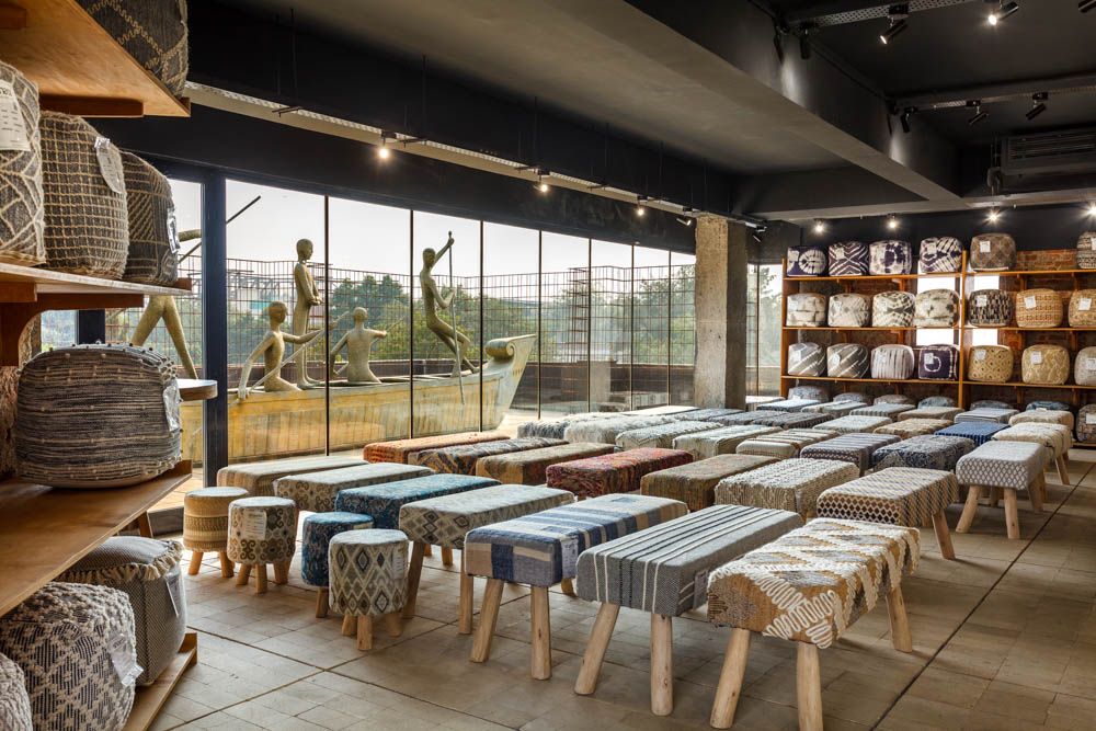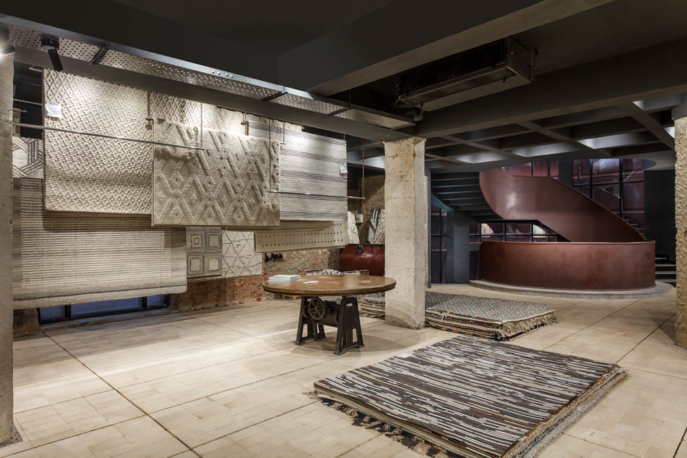 Rug Republic is one of India’s largest international exporters of rugs and soft furniture, and hence, the idea was to create a bare shell — a non-intrusive backdrop to celebrate the brand’s exquisite work. Bare black interiors, rebar cage and other inexpensive interventions for the exhibition offer an unfinished aesthetic to the space. Furthermore, the use of temporary interventions adds to a degree of flexibility to the internal layout. The floors are lined with fire bricks to allow ease of removal for future changes.