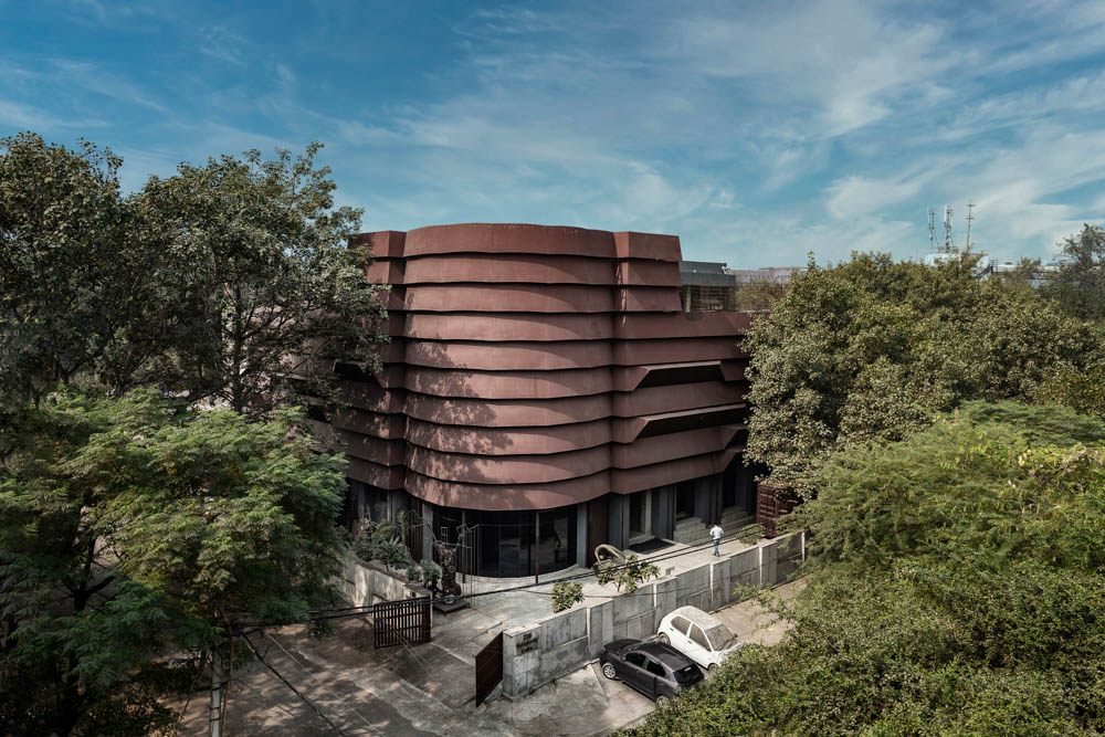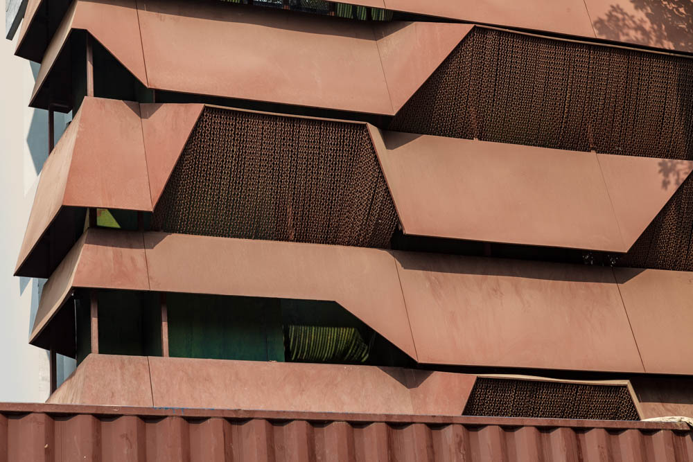 Instead of hiding under a veil of glass and granite, the design aims to make a post-industrial statement that would intrigue the visitor. Okhla is equated to a war zone, and in response, a metal shell envelops the structure to protect the interiors from the hostile and acrid environment. An inward-looking building, therefore, finds its justification in the site’s industrial skyline that offers nothing of visual interest at eye level. The poor air quality and ruckus created by the monkeys in the neighbourhood prevented large openings on the facade. But a visual connection to the outside has been maintained using controlled apertures crafted in corten steel. The jaali screen allows minimal daylight to penetrate within and prevents monkeys from entering the premises.
