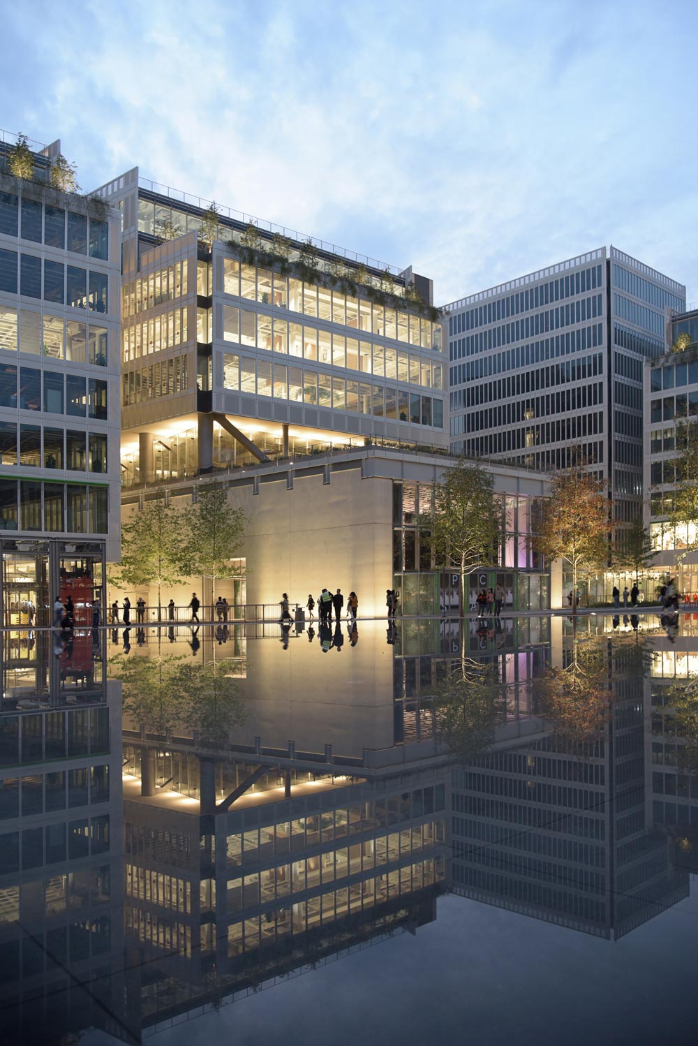공원을 둘러싼 건물은 보행자가 통과하여 내부 녹지 공간에 접근할 수 있어, 여러 행사를 진행할 수 있다. 로비와 소매 시설이 있는 모든 건물은 도심 공원을 향해 안쪽으로 열려있다. 1층의 소매점들은 저철분 유리로 만들어진 캐노피로 가려져있다. 지하 1층에 있는 대형 쇼핑 구역은 계단식 정원을 통해 볼 수 있으며 외부계단을 통해 접근할 수 있다.
