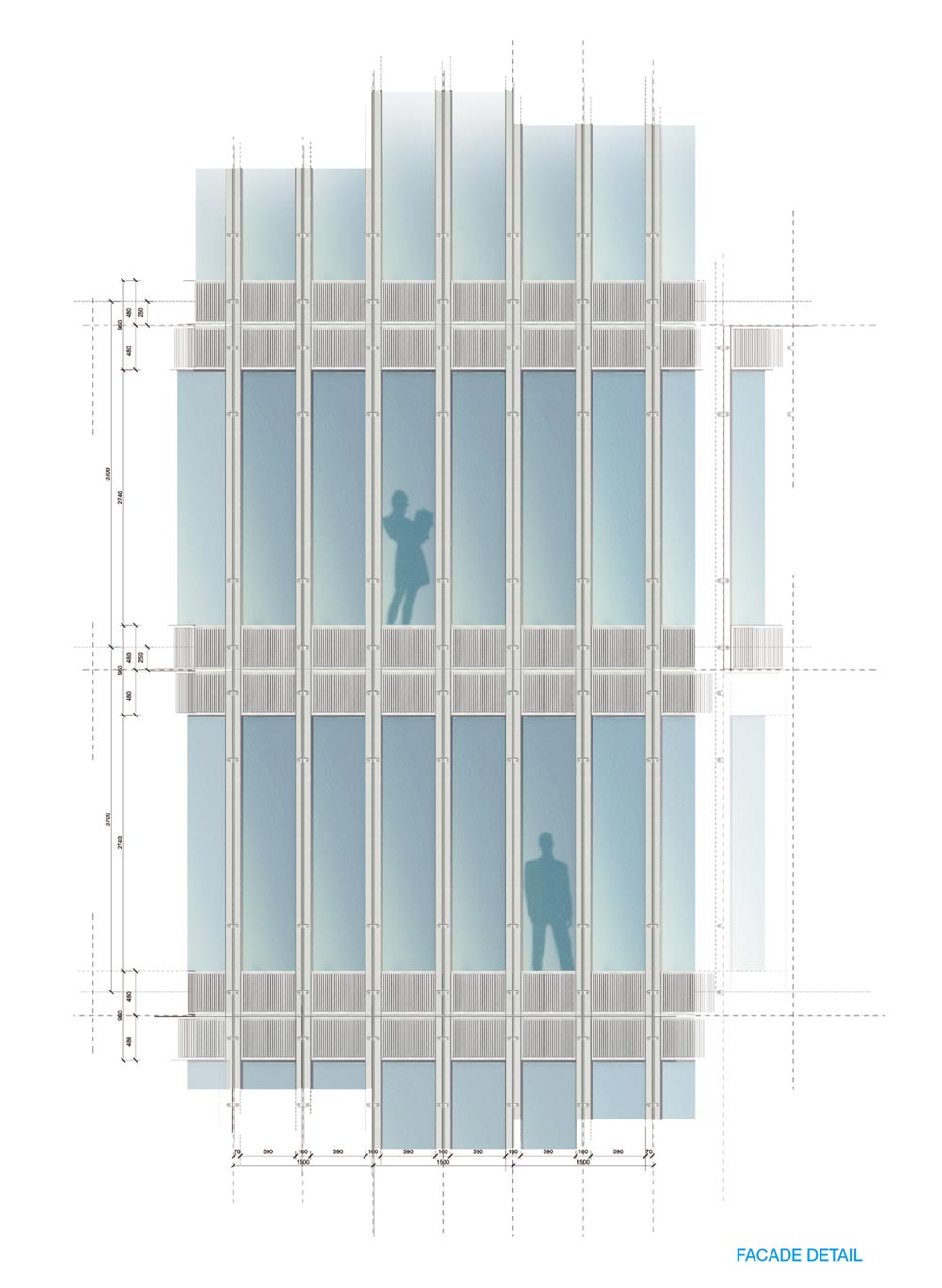 대부분의 건물은 9층이며, 내부 녹지 공간을 향하여 2층 높이가 물러나 있어 일 년 내내 더 많은 자연광을 받을 수 있다. 부지의 서쪽에 있는 두 개 동은 인접한 부지의 기존 건물을 고려하여 더 높게 지어졌다. 건물의 주변을 따라 “절단”된 틈을 통해 내외부에 시각적 다양성을 제공하며, 공기 순환이 좋고 아침과 늦은 오후에는 햇빛이 쏟아진다.