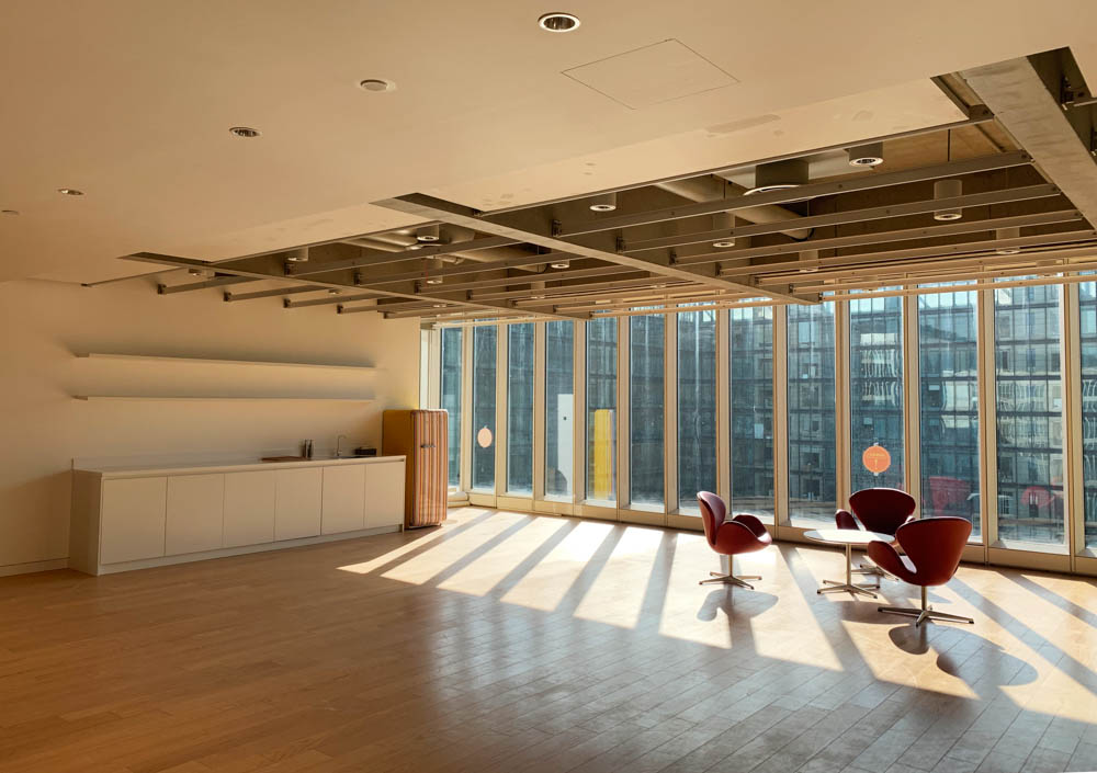 내부 파사드의 상단에 덩굴을 심은 화분과, 내외부의 전동식 차양이 저반사 코팅과 저철분 유리를 사용한 대형 단열창에 충분한 그늘을 제공한다. 이 조합은 열 성능과 최적의 자연채광 제어, 그리고 사무실 공간에 탁월한 색상 표현을 하기에 적합하다. 공원을 향하지 않는 파사드에는 천연 산화 처리된 알루미늄과 좁은 폭의 커튼월이 사용됐다.