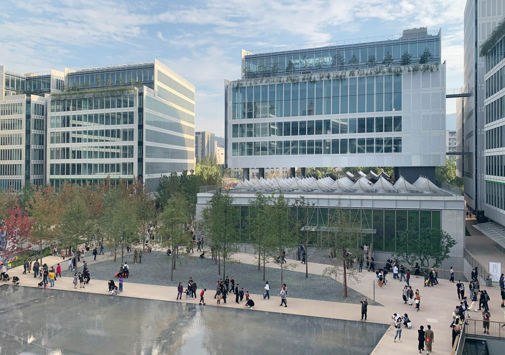 주요 콘셉트는 대부분의 사무실 동을 부지 주변에 배치하여 보호된 대형 내부 녹지 공간인 “도시공원” 또는 “오아시스”를 만드는 것이다. 이 공원은 사람들이 모이거나 배회할 수 있는 정원, 반사 및 잡음을 위한 수변 공간을 수용하고도 남는 규모이며, 친밀감과 흥미를 제공한다.