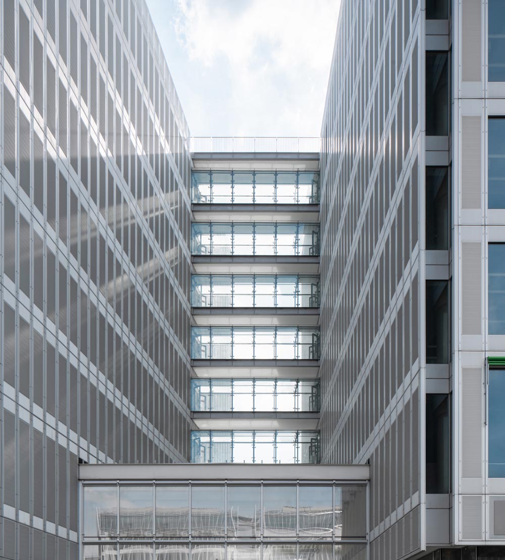 내부 파사드의 상단에 덩굴을 심은 화분과, 내외부의 전동식 차양이 저반사 코팅과 저철분 유리를 사용한 대형 단열창에 충분한 그늘을 제공한다. 이 조합은 열 성능과 최적의 자연채광 제어, 그리고 사무실 공간에 탁월한 색상 표현을 하기에 적합하다. 공원을 향하지 않는 파사드에는 천연 산화 처리된 알루미늄과 좁은 폭의 커튼월이 사용됐다.