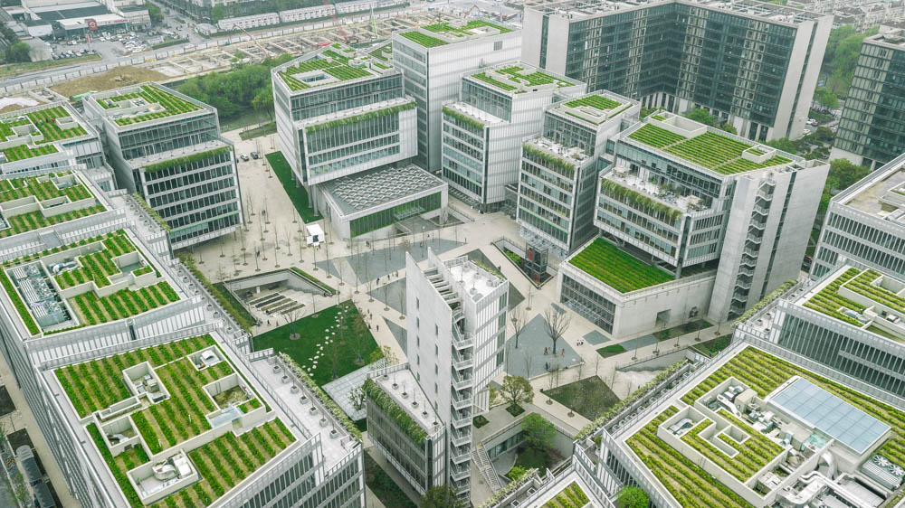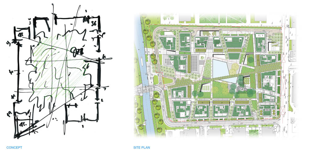 대부분의 건물은 9층이며, 내부 녹지 공간을 향하여 2층 높이가 물러나 있어 일 년 내내 더 많은 자연광을 받을 수 있다. 부지의 서쪽에 있는 두 개 동은 인접한 부지의 기존 건물을 고려하여 더 높게 지어졌다. 건물의 주변을 따라 “절단”된 틈을 통해 내외부에 시각적 다양성을 제공하며, 공기 순환이 좋고 아침과 늦은 오후에는 햇빛이 쏟아진다.