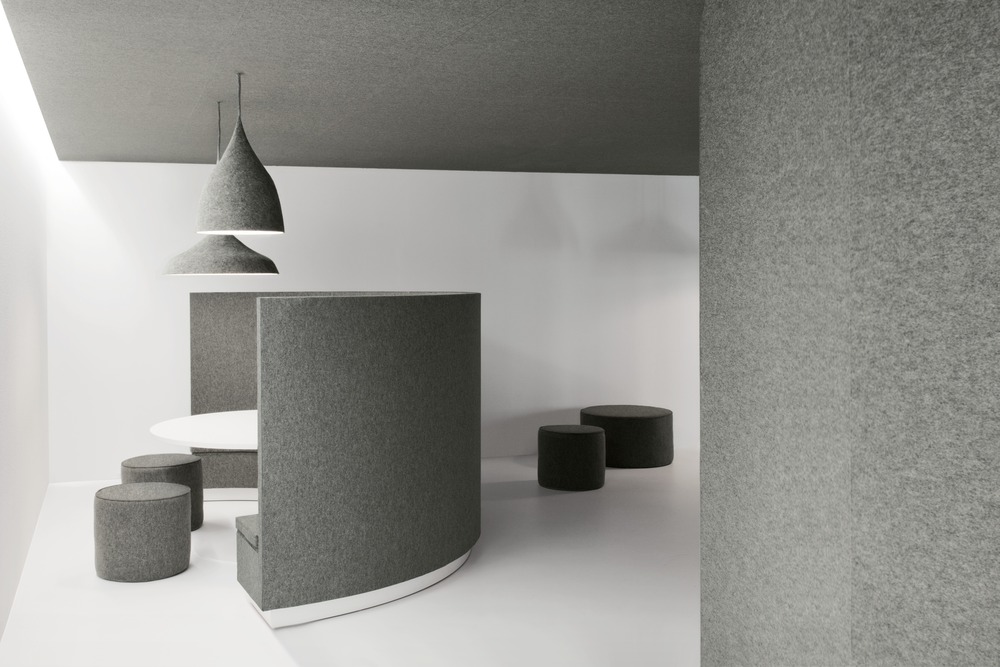 This led us to the use of fabrics. It is playful, and can make a powerful image on a conceptual level, it is perfect for absorbing sound and therefore it creates privacy in open spaces. And we could use it to cover scars of demolition in an effective way. There is probably no other material which can be used on floors, ceiling, walls and to create pieces of furniture and lampshades then felt. It’s also durable, acoustic, fireproof and environment friendly.