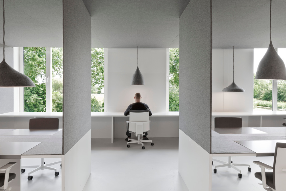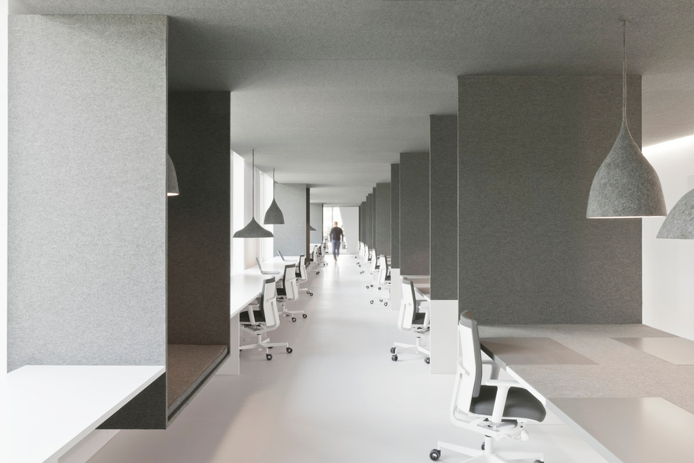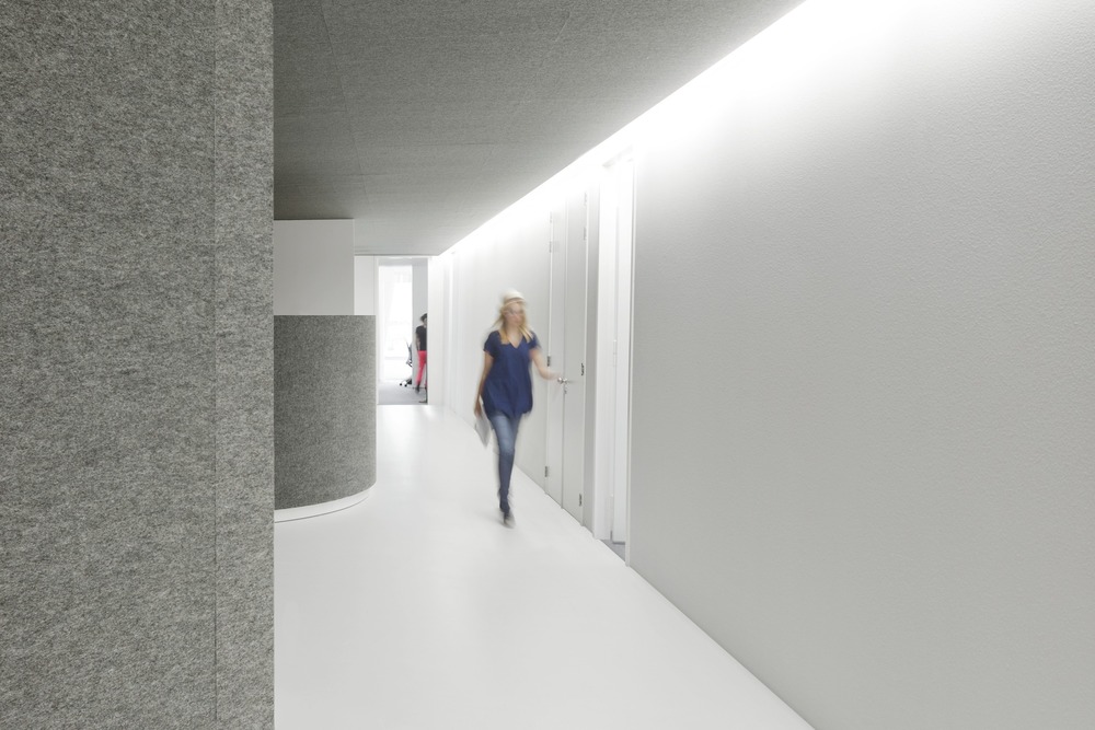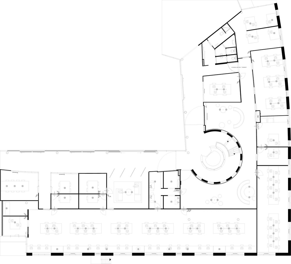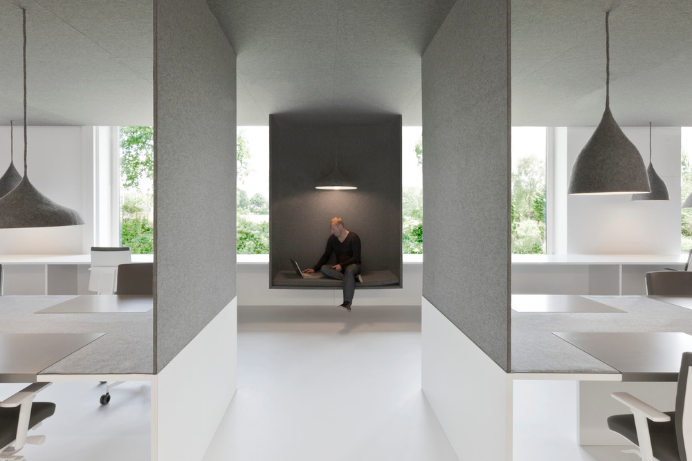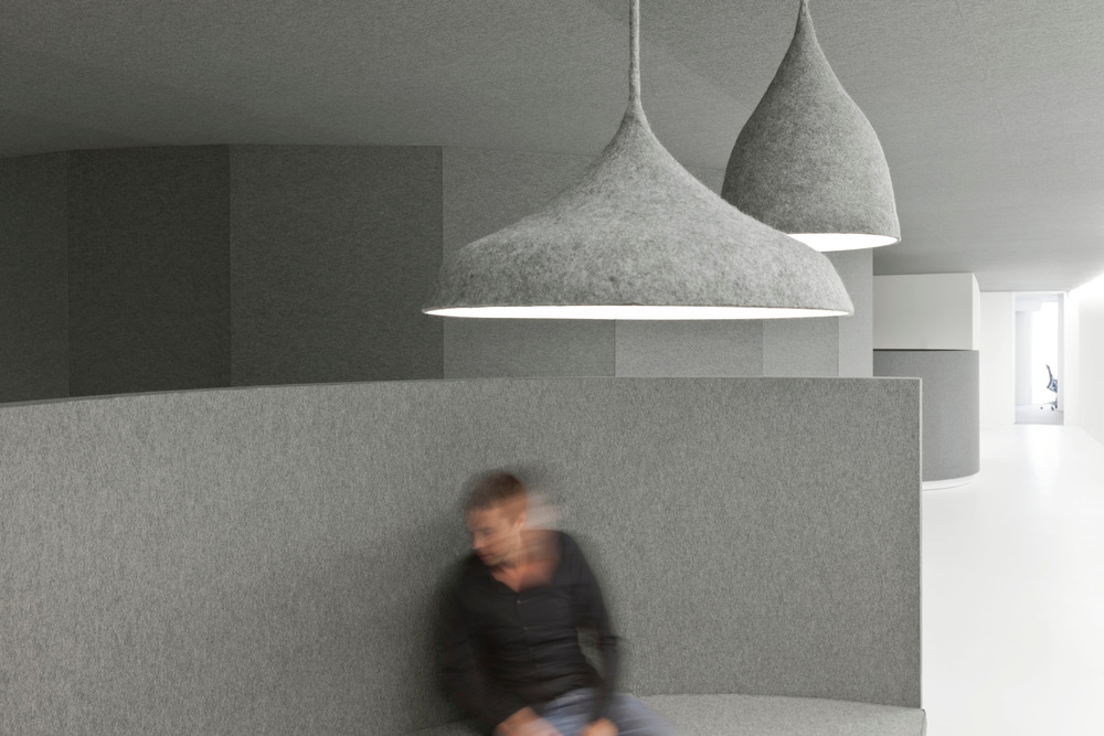 Situated in a building where some structural parts could not be changed it was a challenge to integrate these elements in the design and become an addition to the whole. i29 searched for solutions to various problems which could be addressed by one grand gesture. At first a material which could be an alternative to the ceiling system, but also to cover and integrate structural parts like a big round staircase. Besides that, acoustics became a very important item, as the open spaces for stimulating creative interaction and optimal usage of space was required.