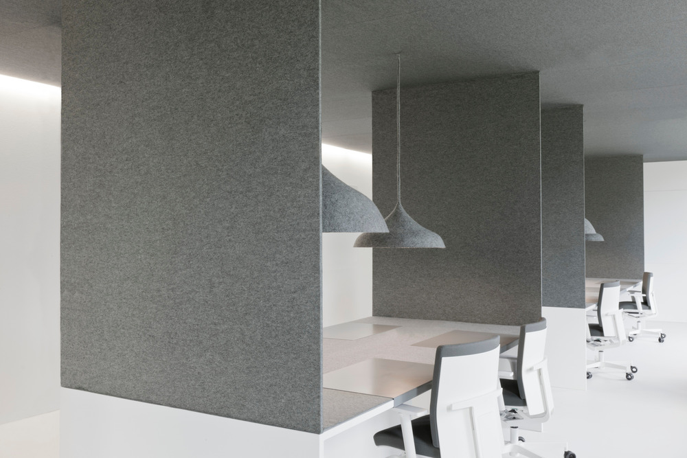 This led us to the use of fabrics. It is playful, and can make a powerful image on a conceptual level, it is perfect for absorbing sound and therefore it creates privacy in open spaces. And we could use it to cover scars of demolition in an effective way. There is probably no other material which can be used on floors, ceiling, walls and to create pieces of furniture and lampshades then felt. It’s also durable, acoustic, fireproof and environment friendly.