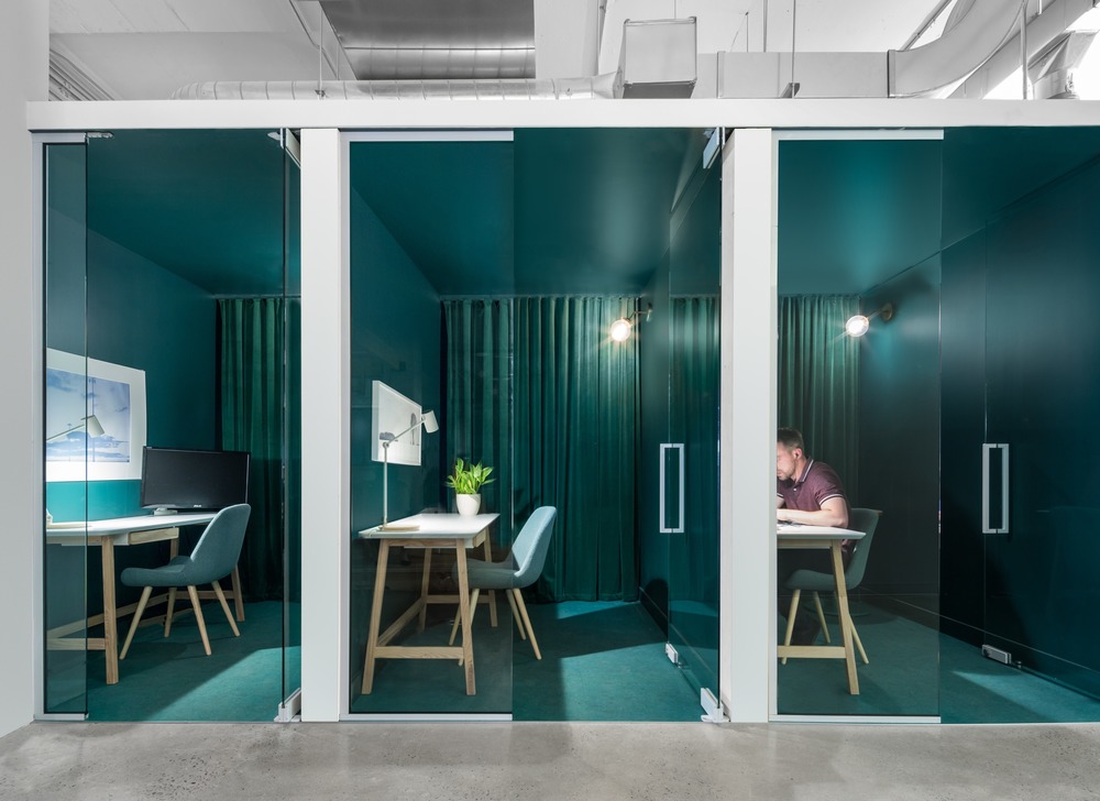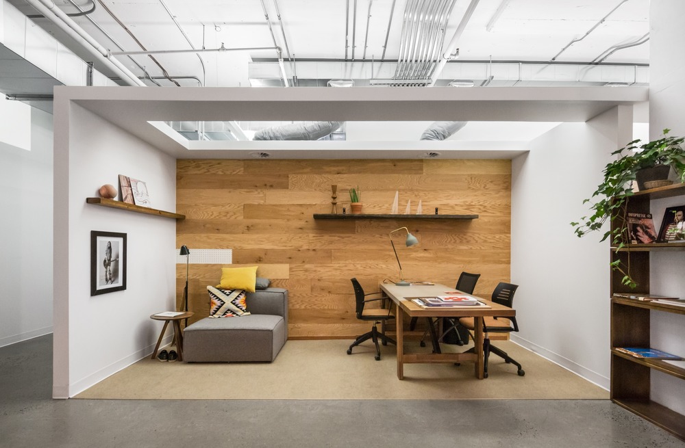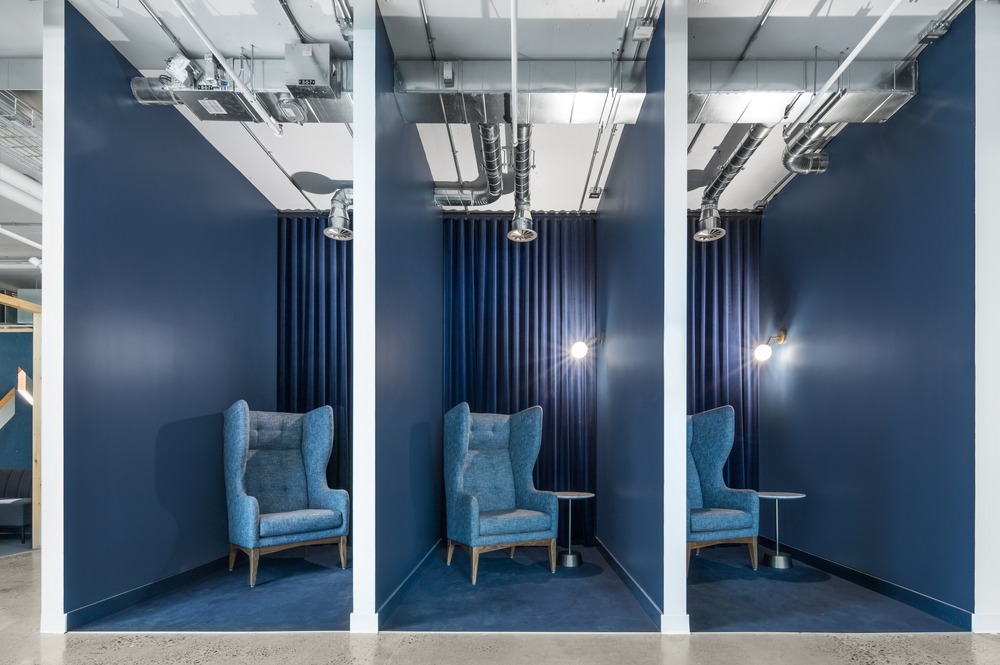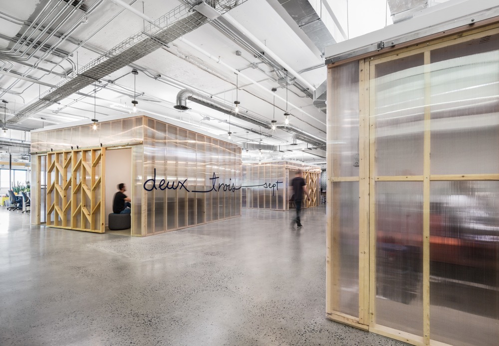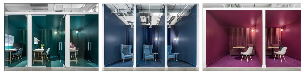 개방된 공간 전체에 배치된 다양한 구성의 수많은 큐브와 작은 알코브(Alcove: 벽면을 오목하게 하여 만든 공간)는 업무가 프라이버시 또는 고요함을 필요로 할때(비공식 회의, 고객 회의, 전화 통화, 특정 작업에 대한 집중 등)이 필요할 때 주변의 소란으로부터 벗어날 수 있게 한다. 그러나 이 폐쇄된 작업 공간에는 폴리카보네이트 또는 유리로 된 투명 파티션이 있기 때문에 커뮤니티와의 연결은 중단되지 않다. 이러한 전략적 공간은 건축적인 볼륨을 조각하고 로프트의 인상적인 광대한 규모를 보다 인간적인 규모로 만드는 것 외에도, 공간에 역동적인 시각적 효과를 창출하면서 이동의 자유를 최적화하고자 하는 클라이언트의 요구 사항을 충족시켜준다.