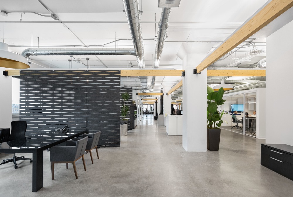 The client’s mandate for Imperatori Design’s firm was summed up in one sentence: “Create a unified environment, heterogeneous, alive, where one would feel a positive vibe immediately upon entering.” Located in a classic Mile-End industrial building, the location had the advantage of having access to daylight on three sides as well as having a polished concrete floor with a beautiful effect. The constraints were rows of industrial ducts beneath the high ceilings along with a very tight 13-week schedule.