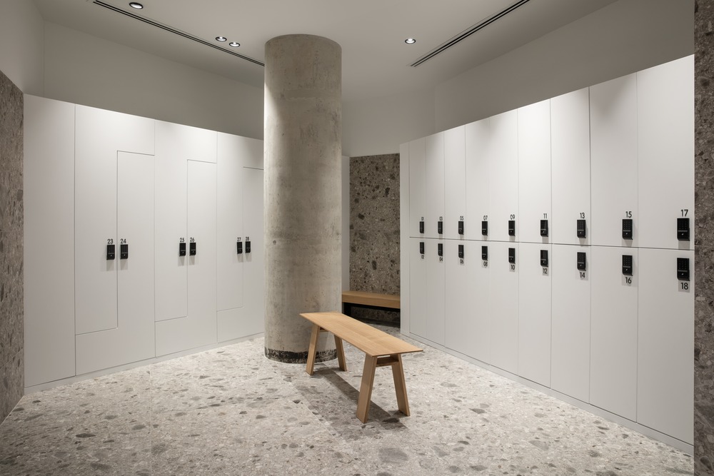 The reception/juice bar was designed as a communal space with a 17-meter-long glass façade on the main street creating a meeting point for the design community where they can meet after their daily workout or for non-members to stop by and grab a healthy smoothie or salad while experiencing the ambience of the gym.