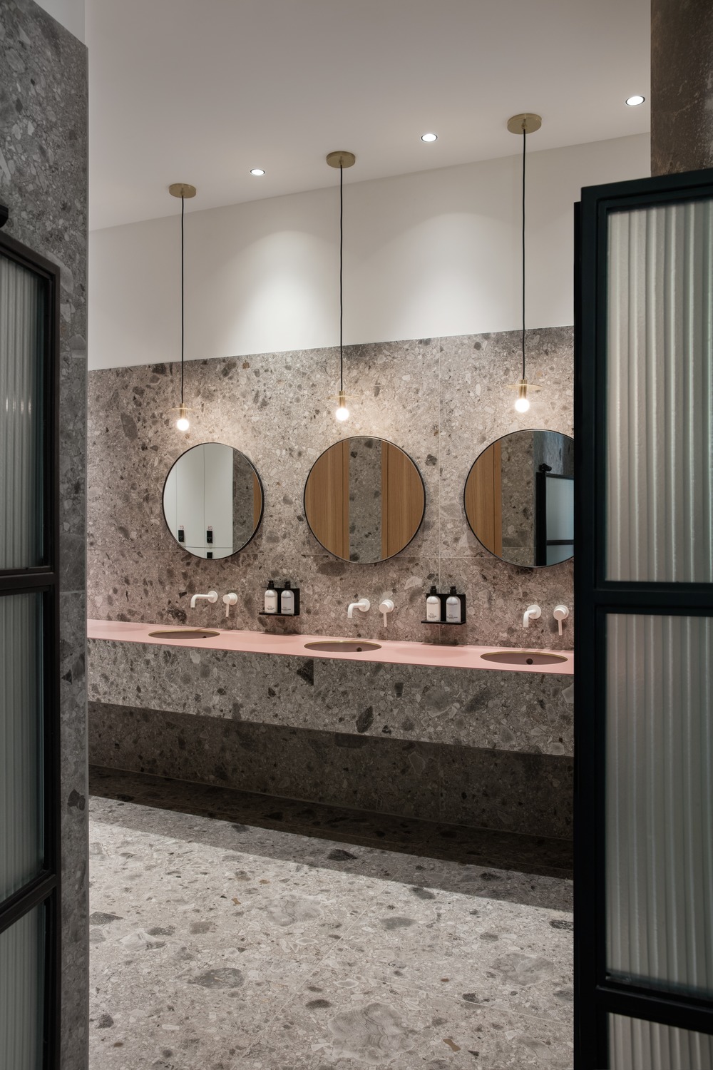 The reception/juice bar was designed as a communal space with a 17-meter-long glass façade on the main street creating a meeting point for the design community where they can meet after their daily workout or for non-members to stop by and grab a healthy smoothie or salad while experiencing the ambience of the gym.