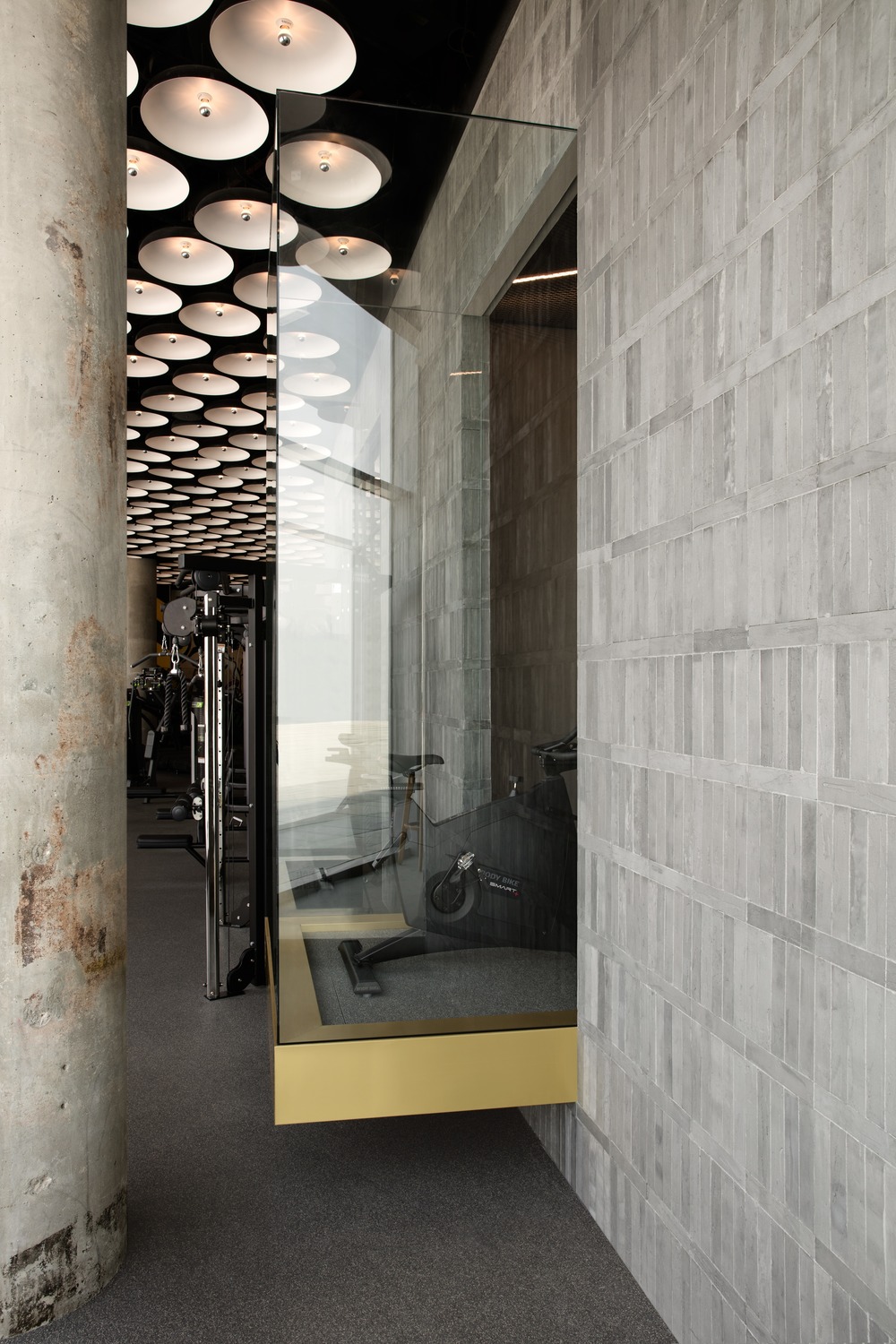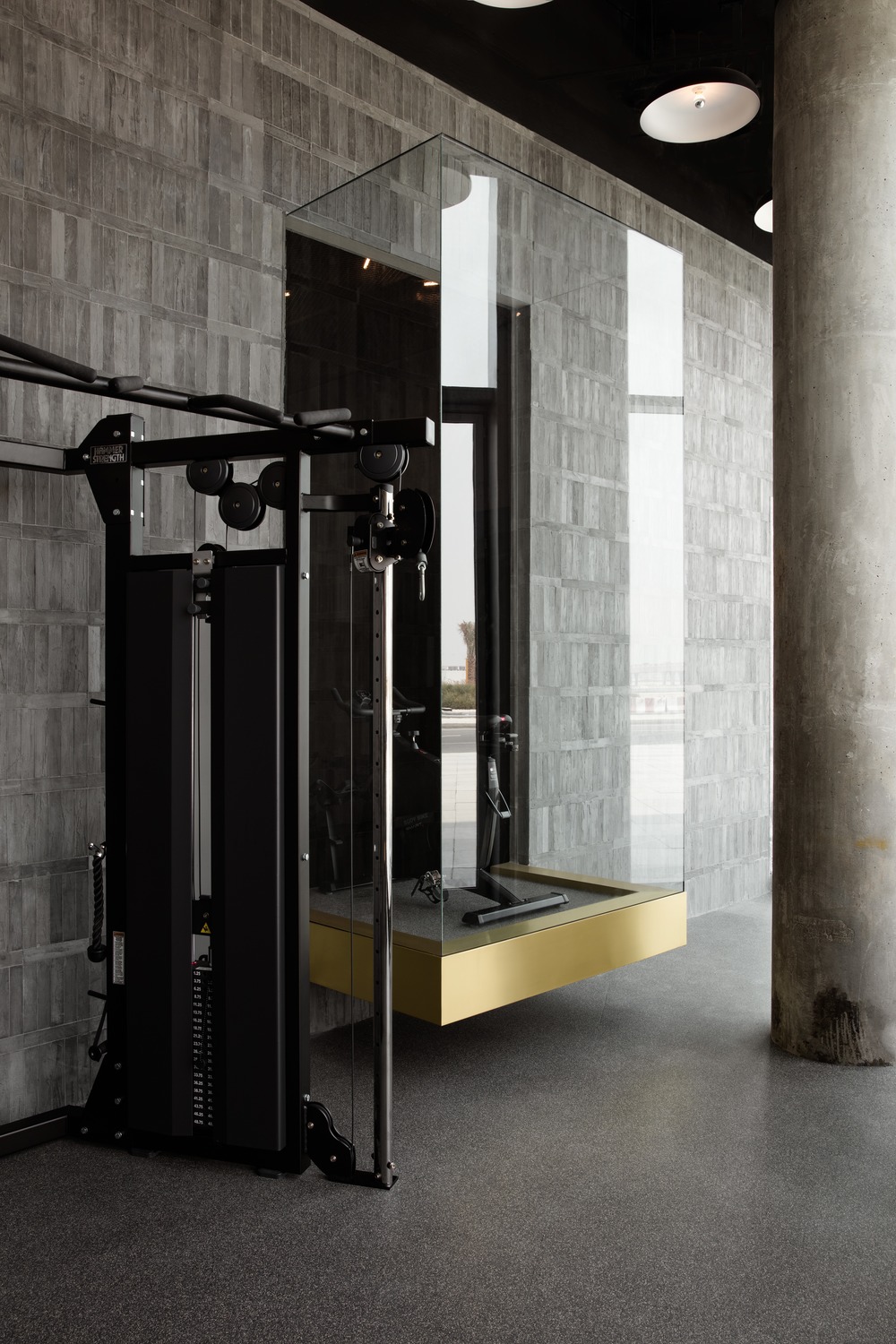 Inspired by brutalism in architecture and underground fight clubs, VSHD was determined to refrain from using the usual materials found in most health clubs. The architects used materials—not in the lexicon of modern—like concrete bricks combined with gold-copper alloy to make it look current, while at the same time creating modes that are elegant, warm and muscular. Specifically customized LED suspended light used to conceal all the ceiling services while maintaining an overall vibrant lighting mood that can be controlled by the different exercise zones.