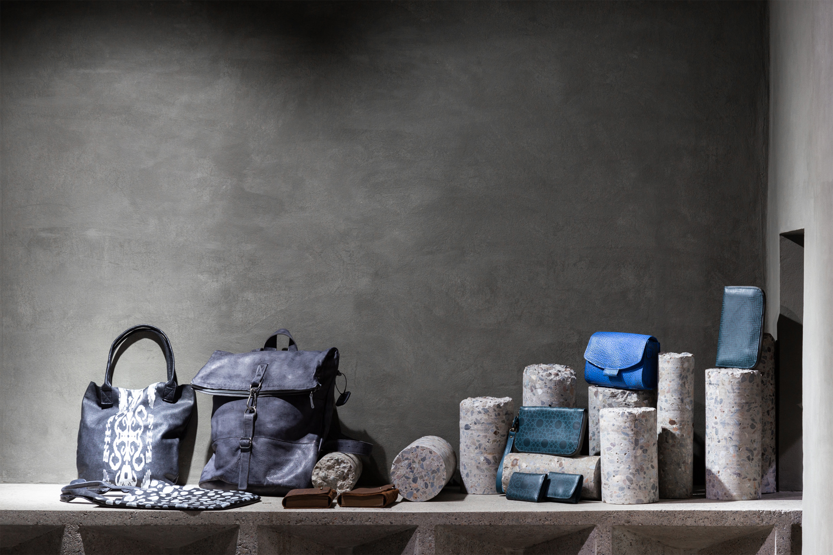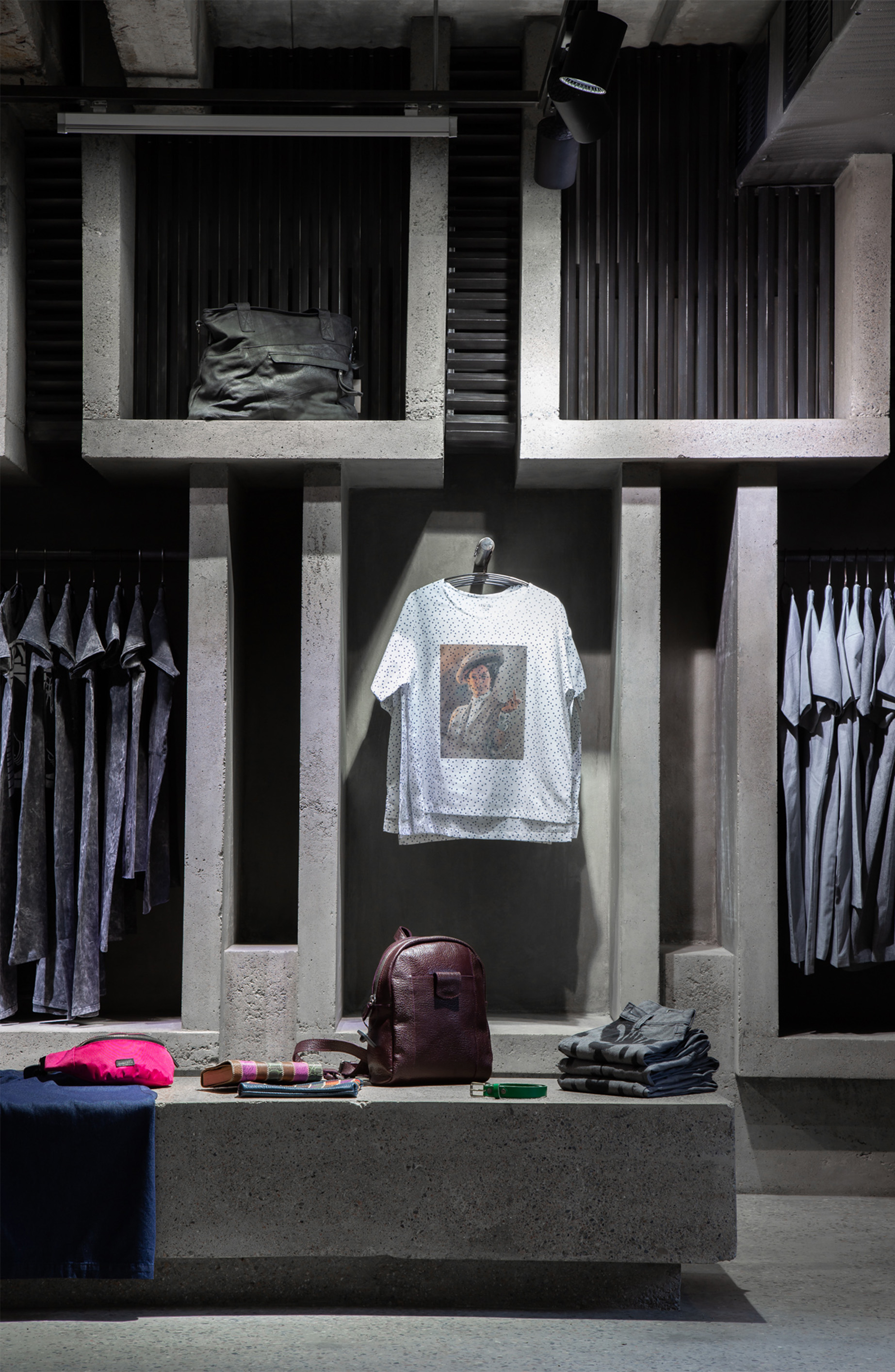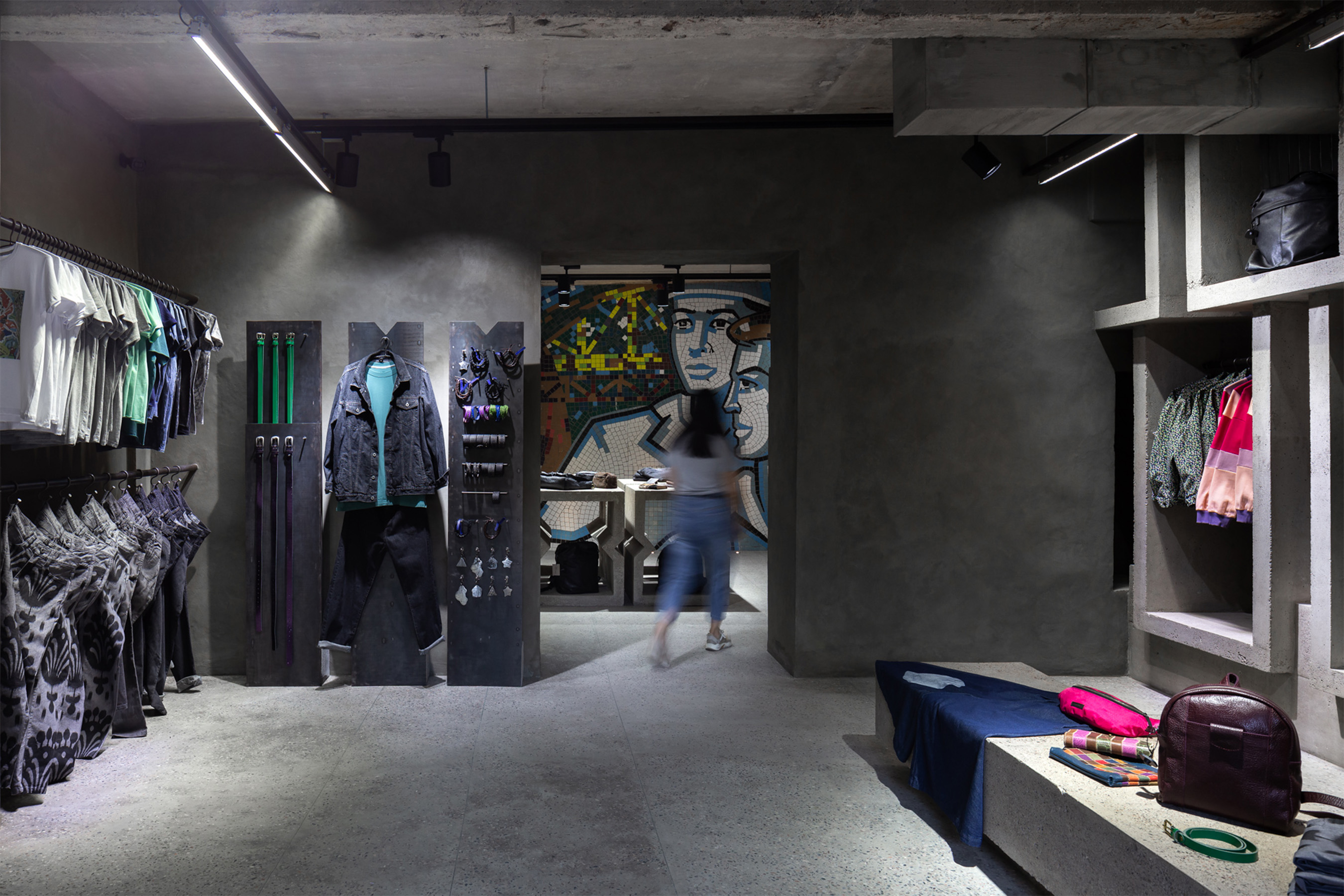 In the central part of the store there is an accessory area and a checkout counter. On the left side of the store is the leather goods area, and on the right is the clothing area with a small courtyard. The interior uses images of sun-protection structures, elements of monumental art and mosaics. All interior elements are made exclusively of concrete and metal and decorated with mosaic panels.