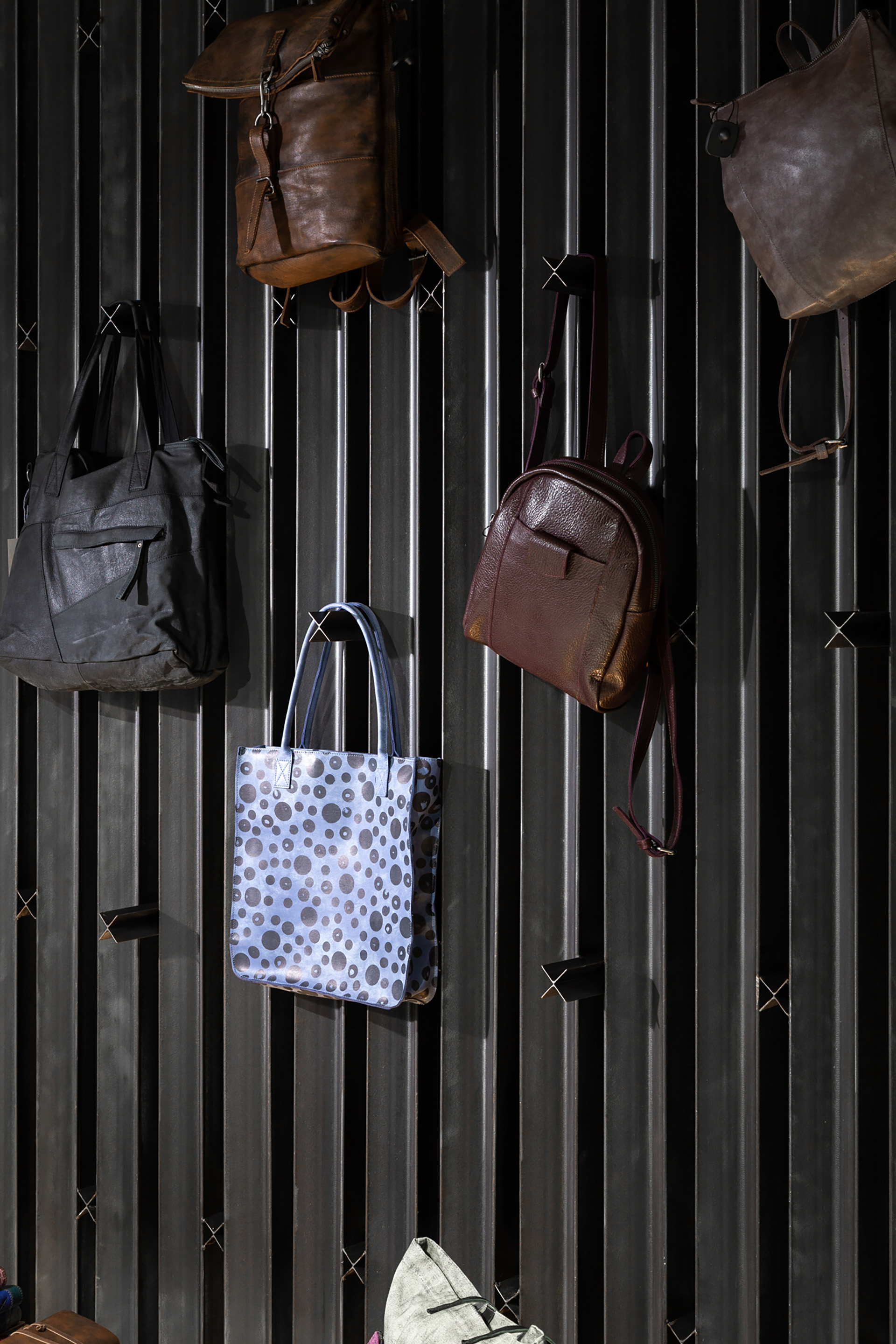 매장 중앙에는 액세서리 코너와 계산대가 있다. 매장 왼쪽은 가죽제품 코너, 오른쪽은 작은 안뜰이 있는 의류 코너이다. 내부는 태양 보호 구조물, 기념비적인 예술과 모자이크의 요소들의 이미지를 사용한다. 모든 내부 요소는 콘크리트와 금속으로만 이루어져 있으며 모자이크 패널로 장식되어있다.