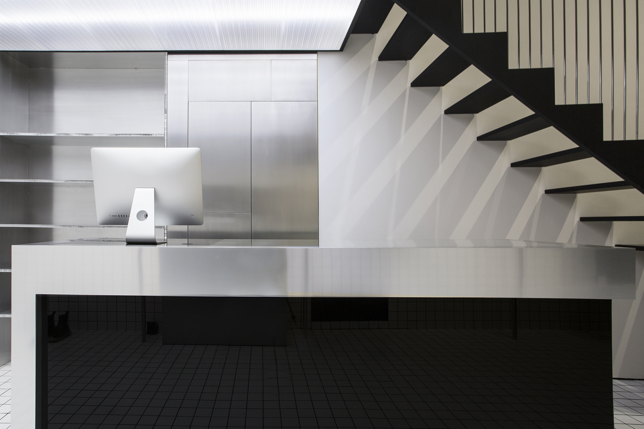 The store's interior renovation, located in a historic building, develops on two levels for a total area of 105 sqm. At the entrance of the building, a tiled grid on the floor and partially on the wall, enhances the enlongated-shape character of the space. The massive pre-existing structure of the mezzanine, becomes the decisive factor separating the different moods of the two levels. Completely covered in alveolar polycarbonate, it is conceived as a large lighting fixture which, by intensity dimming, can be perceived as pleasantly indefinite and diaphanous. The staircase is characterized by a painted steel handrail that varies along its path. The mezzanine floor, is designed as a more intimate and welcoming space: it combines traditional materials, like wall surfaces in raw plaster and a wooden floor, with more contemporary ones, as with the fitting rooms covered in aluminium and mirrors, or the clothes exhibitors made of Alucore panels, all in continuity with the ground floor.