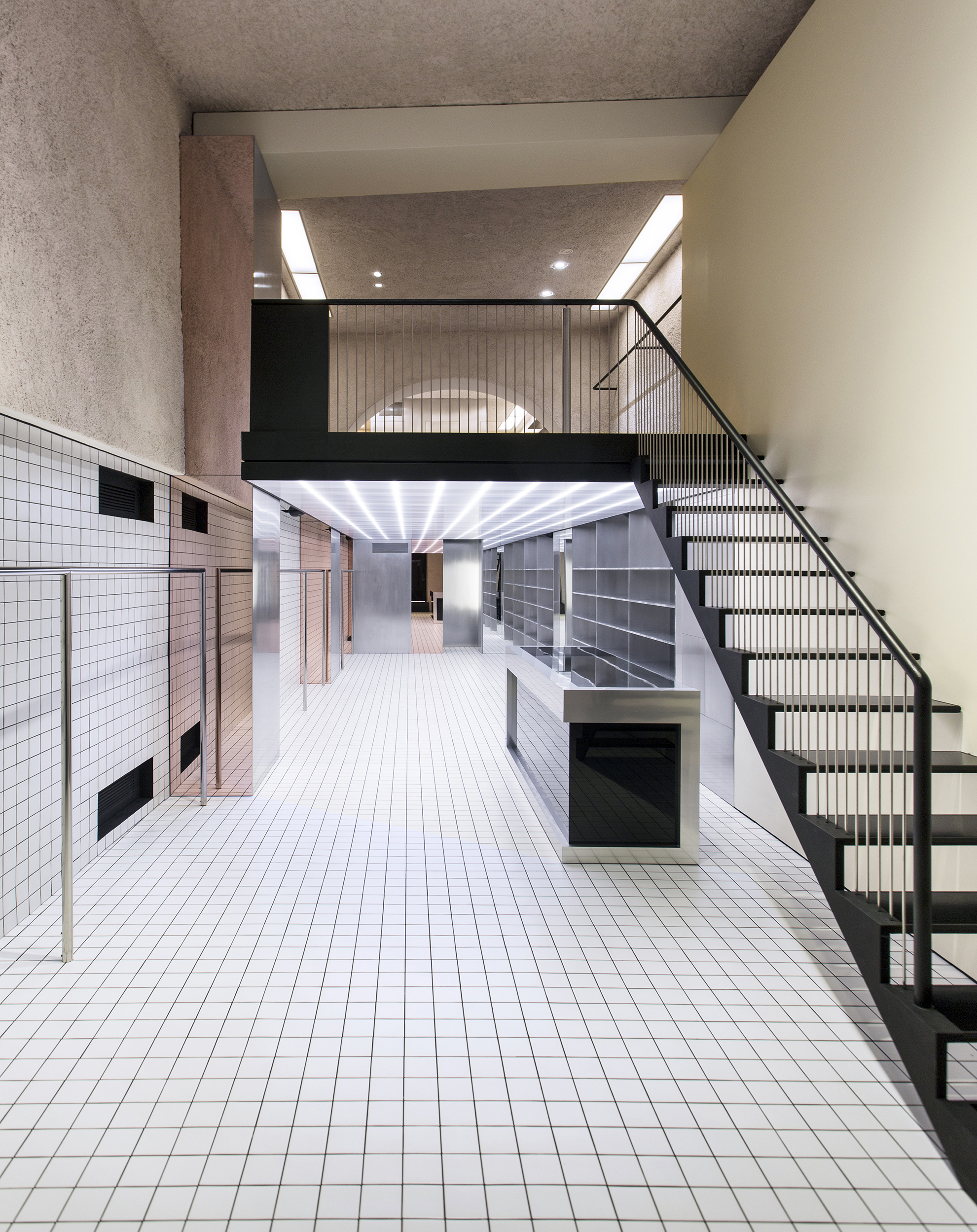 메자닌 층은 좀 더 친밀한 공간으로 설계됐다. 회반죽이나 나무 바닥의 벽 표면과 같은 전통적인 재료와 알루미늄과 거울로 덮인 피팅룸이나 알루코어 패널로 만들어진 의류 전시와 같은 현대적인 재료를 조화롭게 사용했으며, 모두 1층과 연속된다.