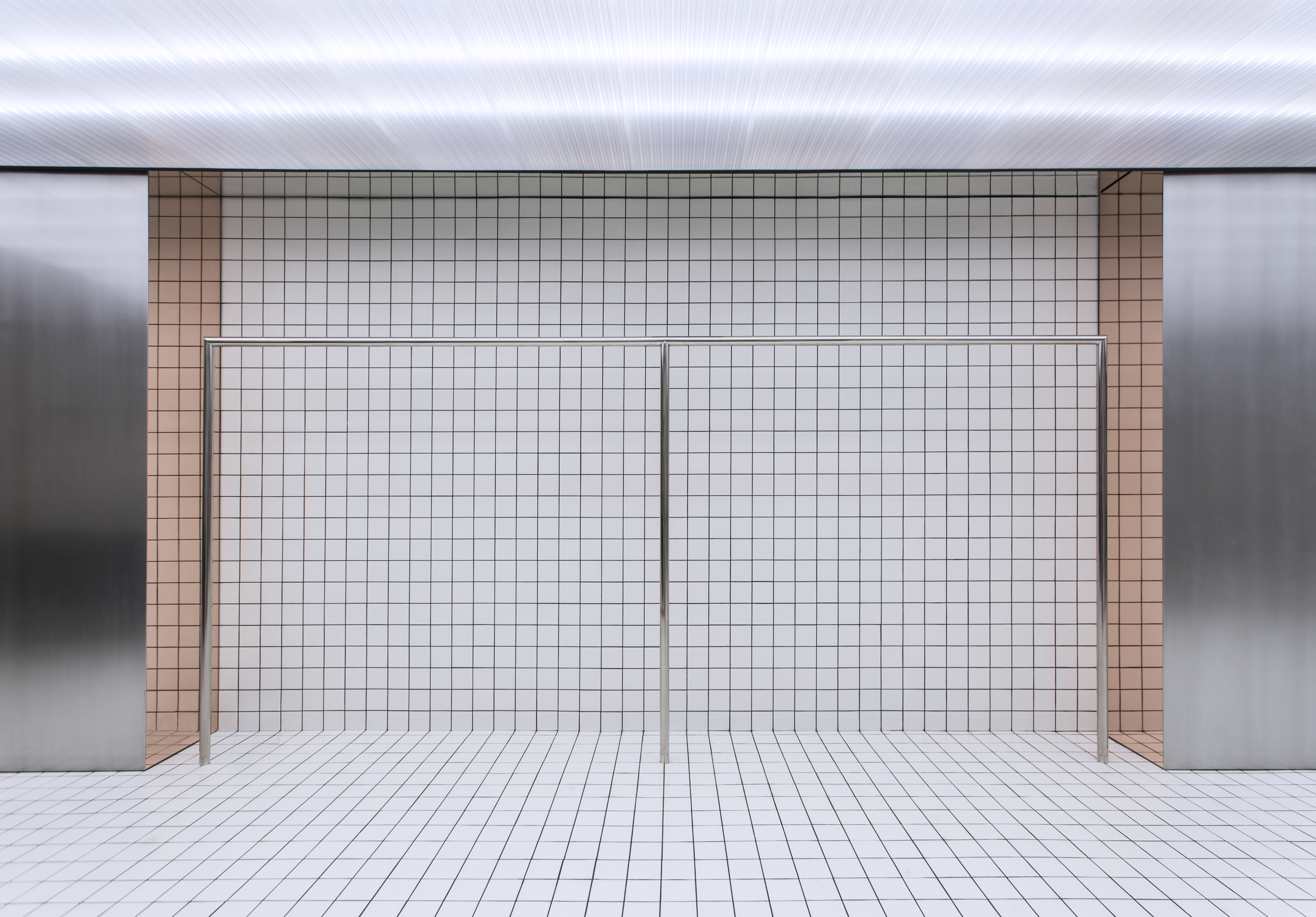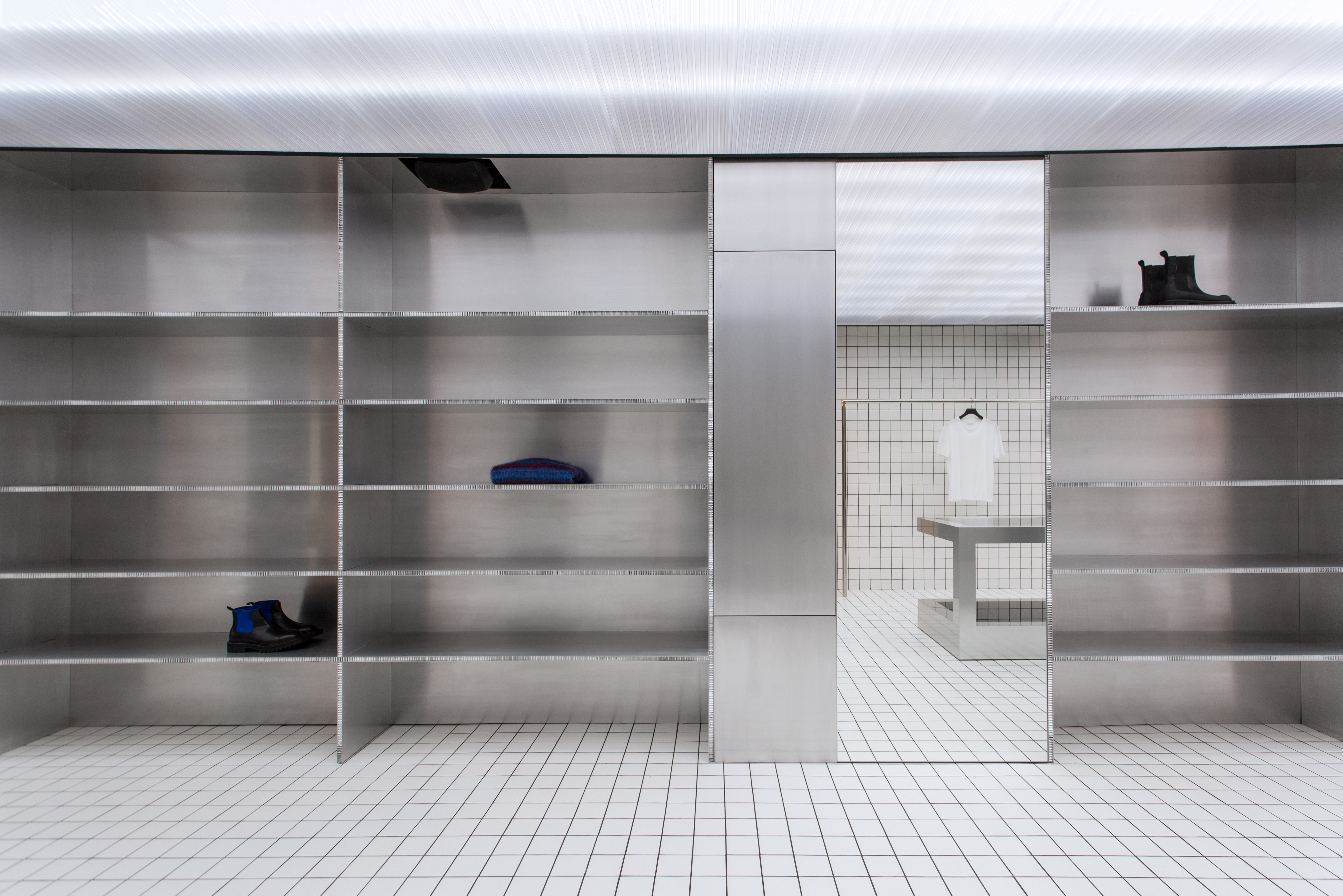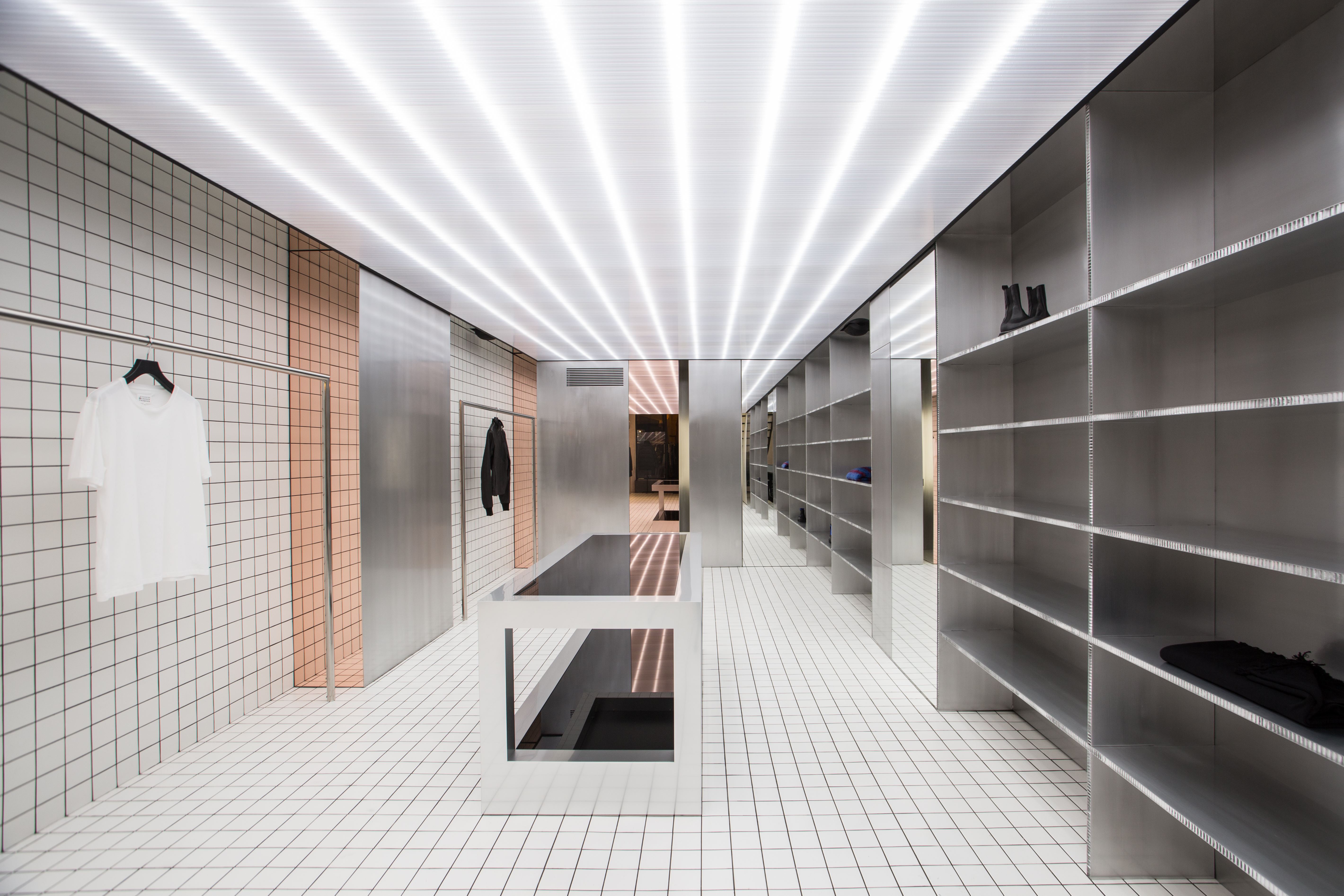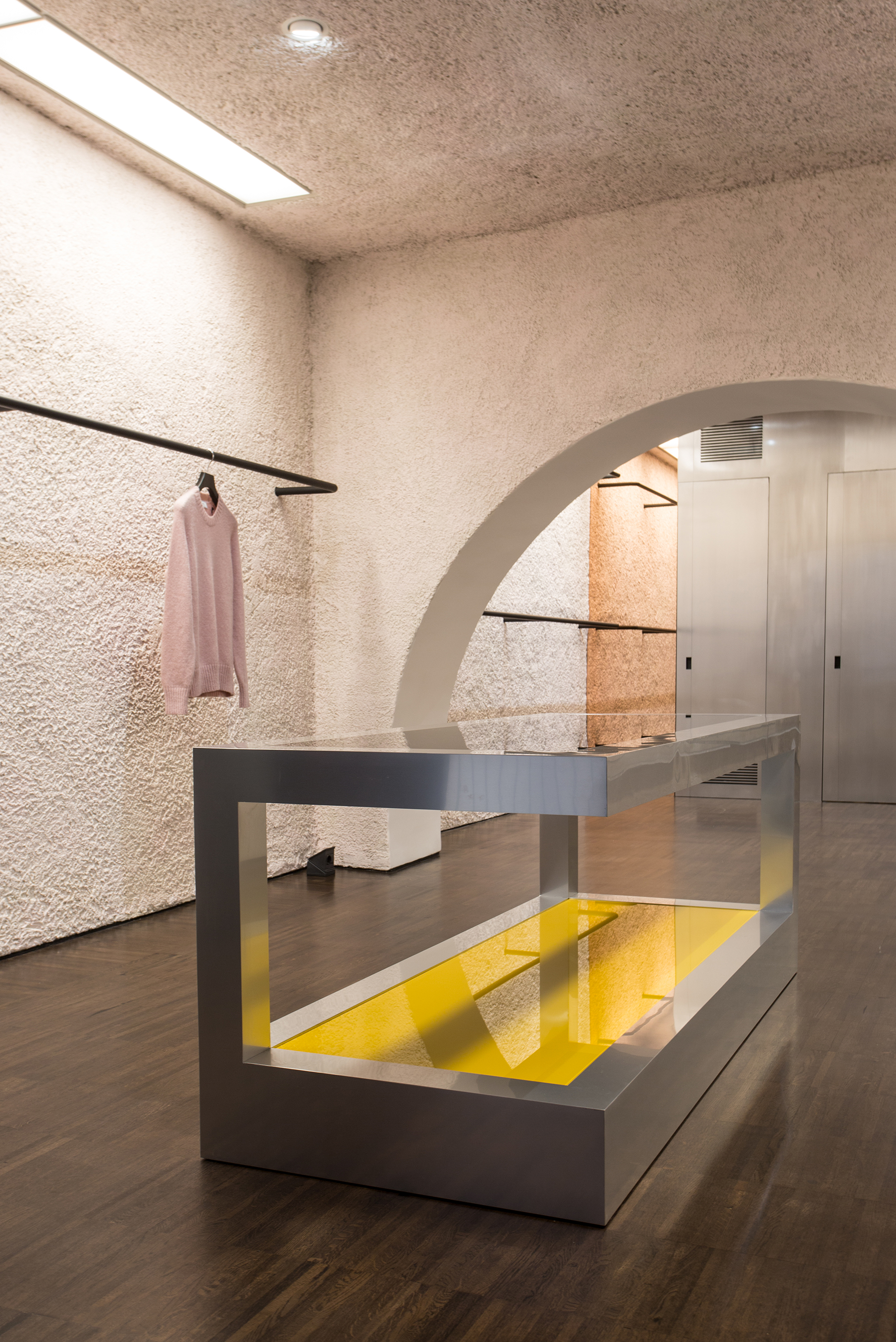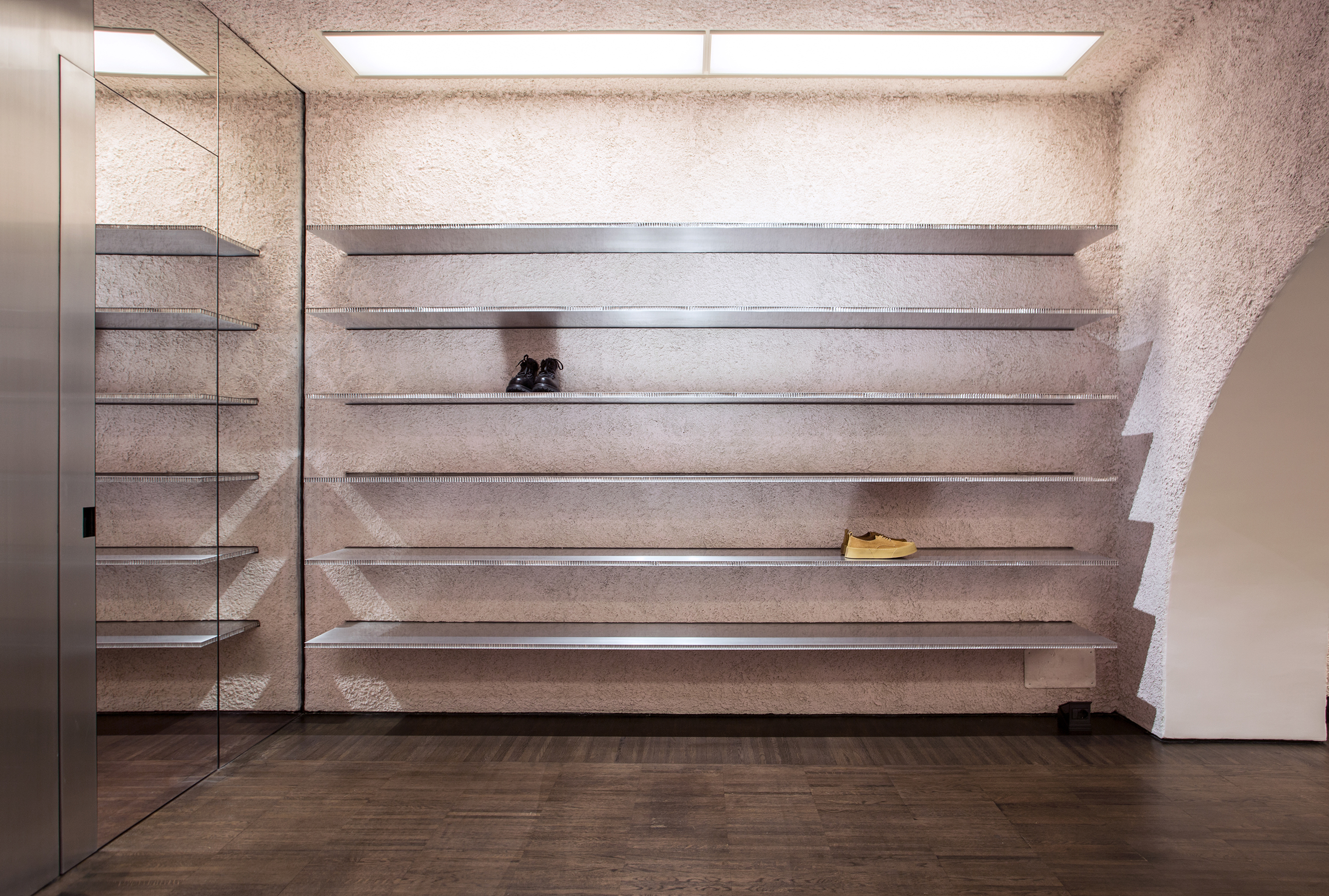 The store's interior renovation, located in a historic building, develops on two levels for a total area of 105 sqm. At the entrance of the building, a tiled grid on the floor and partially on the wall, enhances the enlongated-shape character of the space. The massive pre-existing structure of the mezzanine, becomes the decisive factor separating the different moods of the two levels. Completely covered in alveolar polycarbonate, it is conceived as a large lighting fixture which, by intensity dimming, can be perceived as pleasantly indefinite and diaphanous. The staircase is characterized by a painted steel handrail that varies along its path. The mezzanine floor, is designed as a more intimate and welcoming space: it combines traditional materials, like wall surfaces in raw plaster and a wooden floor, with more contemporary ones, as with the fitting rooms covered in aluminium and mirrors, or the clothes exhibitors made of Alucore panels, all in continuity with the ground floor.