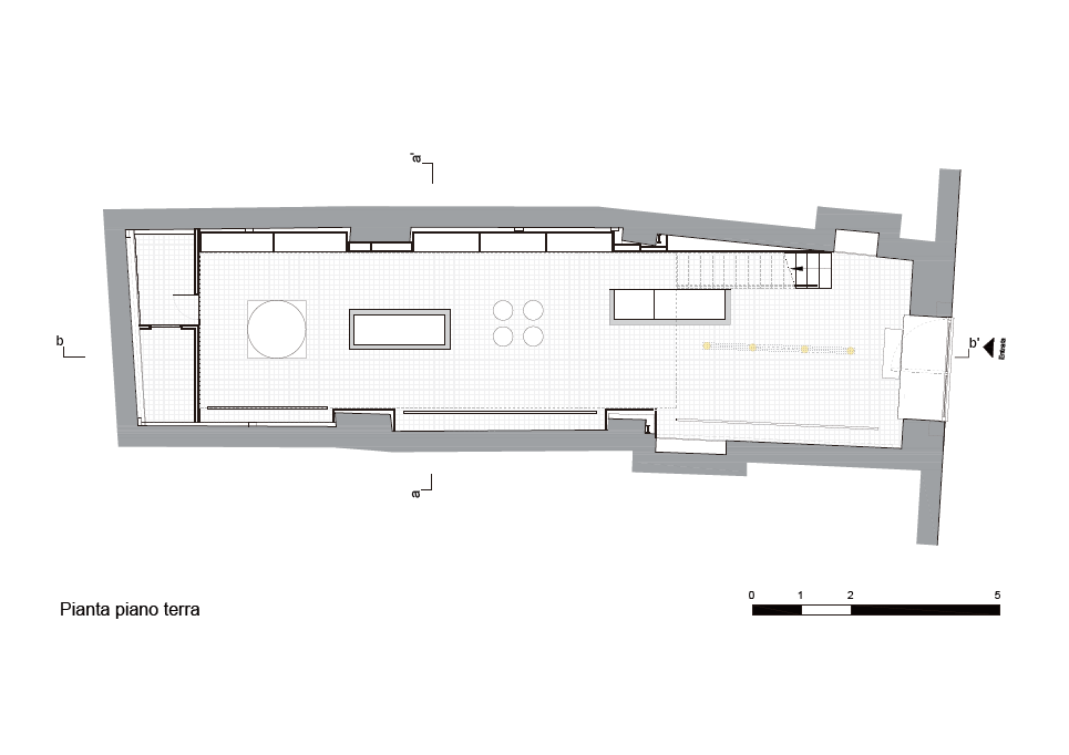 역사적인 건물에 위치한 매장의 인테리어 리노베이션은 총 105㎡의 두 개 층으로 진행됐다. 건물의 입구에는 바닥과 벽의 타일 격자가 있어 공간의 긴 형태 특성을 향상한다. 기존의 거대한 메자닌 구조는 두 층의 서로 다른 분위기를 구분 짓는 결정적 요소가 된다. 폐포 폴리카보네이트로 완전히 덮인 조명기구는 밝기 조절을 통해 쾌적하게 무한하고 비좁은 것으로 인식될 수 있는 대형 조명 기구로 간주된다. 계단은 경로를 따라 다양한 도색된 강철 난간이 특징이다.