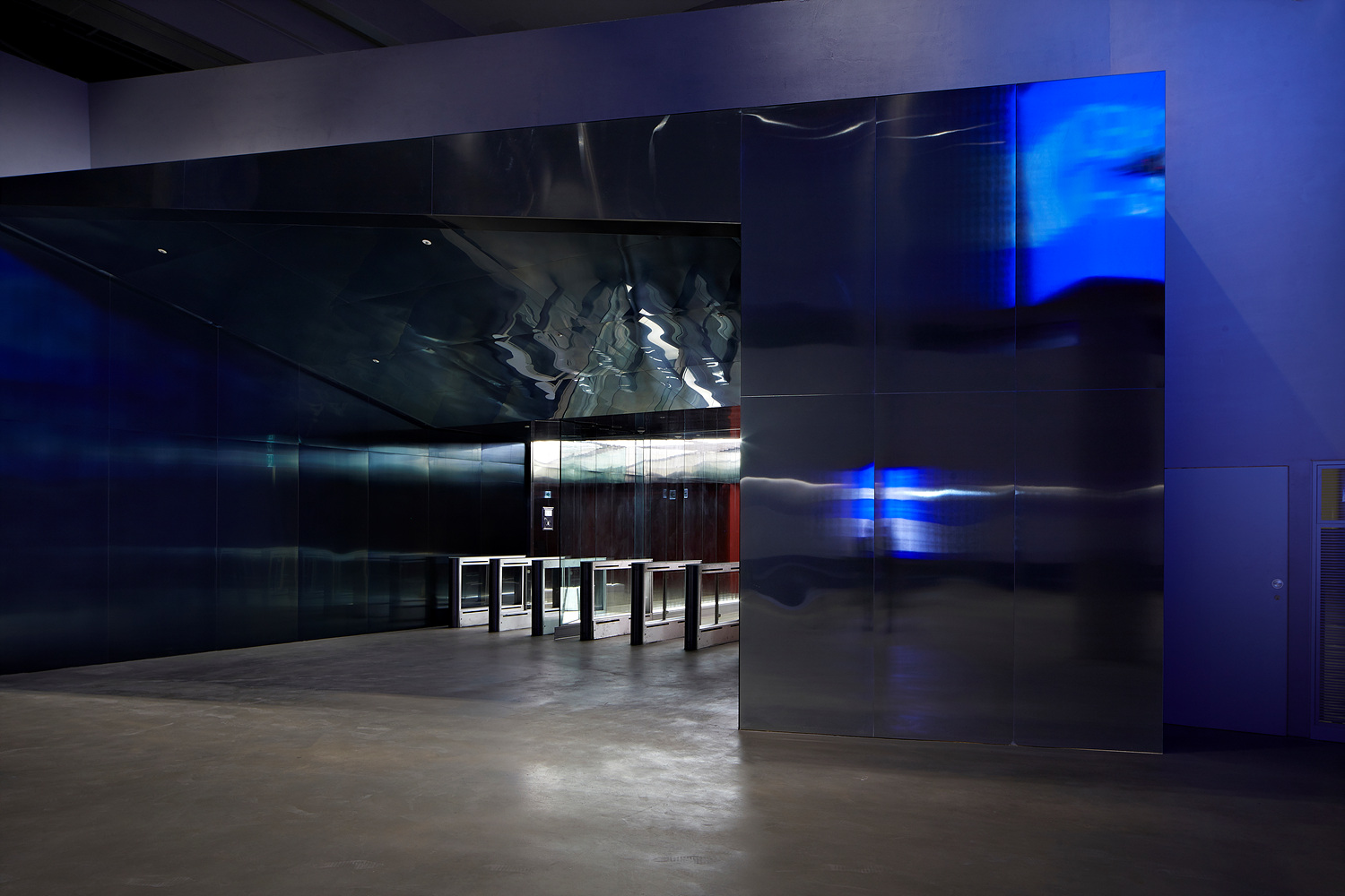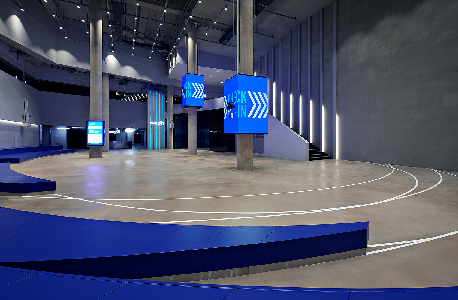 The check-in gate, which taps the wearable for racing, is designed with the concept of transitioning from daily life to fun space to give a feeling that transcends time and space. As soon as passing through the check-in gate, the open space realized an overscale box that seemed to be sucked in using strong reflective materials, and a three-dimensional space was created by turning the walls inside the box at various angles using color pattern lighting and contrasting colors. In addition, the straight, diagonal ceiling design was planned for the purpose of guiding direct guidance