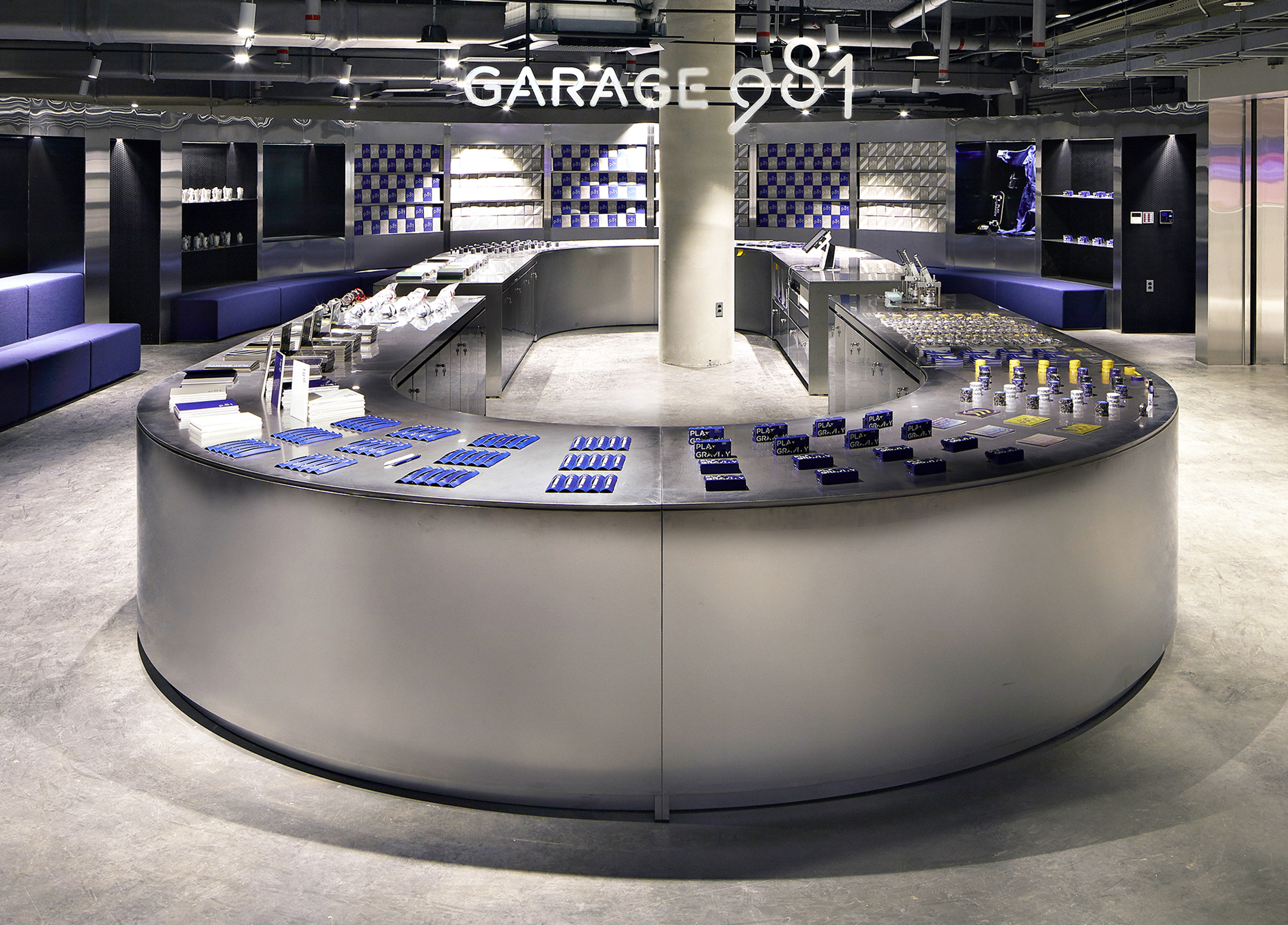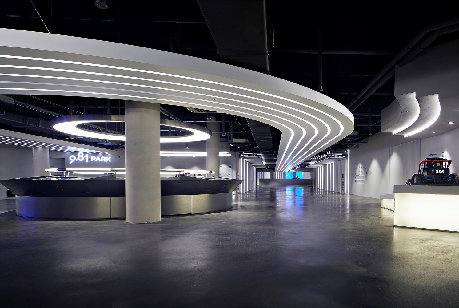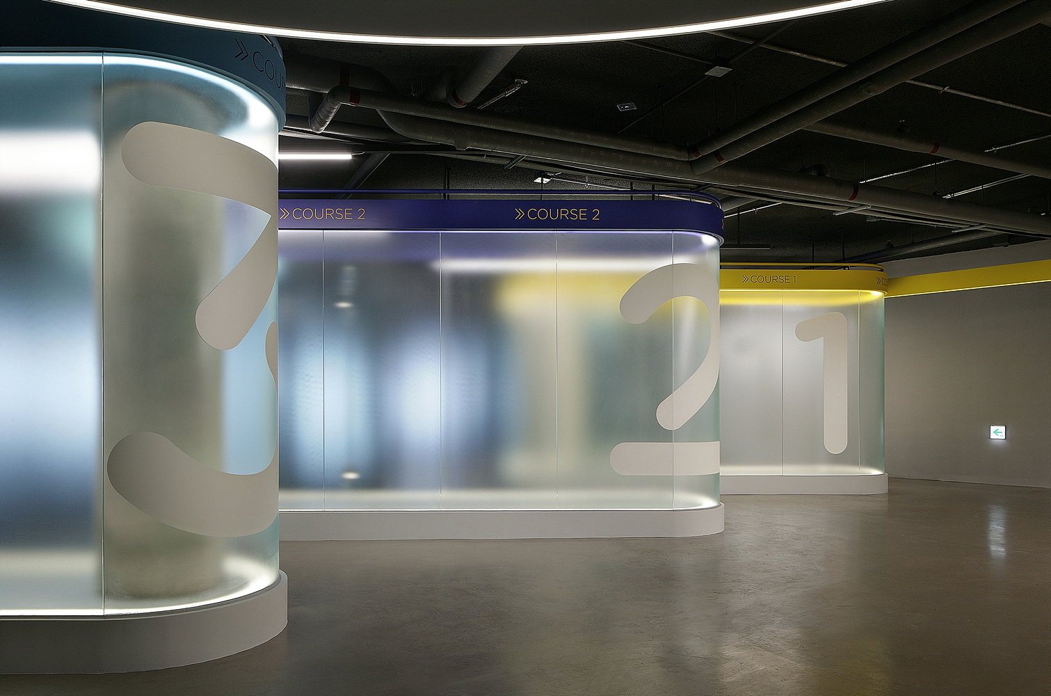 The third floor is a space where all customers experience, and a structural form that separates three courses and a device that allows a large number of people to watch safety education videos at the same time was essential. The shape of the structure was inspired by the brand pattern and the pipe used in the vehicle, and the capsule shape was produced as a motif, and the brand color was designated for each course so that customers could easily recognize it. The space efficiency was maximized by installing a beam projector that can be projected as a single focus on a large capsule-shaped translucent glass wall surrounding a circular column that is structured inside the indoor space. The form of barisol lighting applied to the space and the streamlined band structure are symbolic elements of the 9.81 Park identity to express infinite scalability.