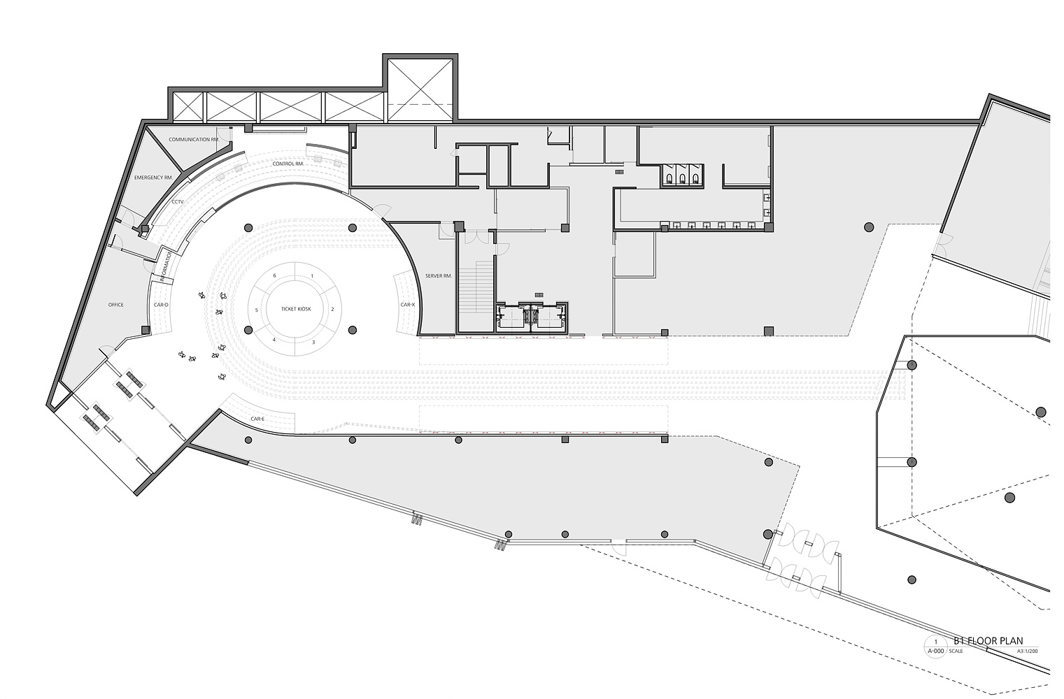 방사형으로 된 커다란 원형 밴드의 티켓발권 키오스크 테이블이 공간의 중심역할을 하는 BASE(입구 홀)에는 반원형 곡면 유리벽을 설치하여 파크의 전체 시스템을 집약적으로 보여주는 종합관제실이 다 보여질 수 있게 하였다.