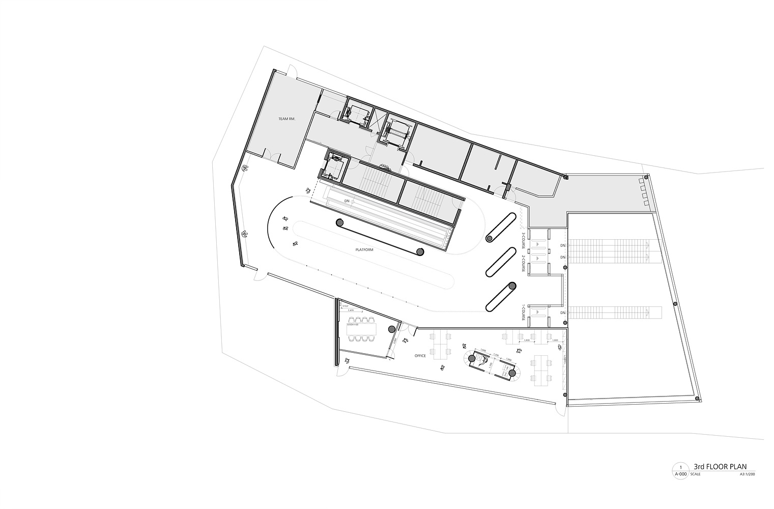 3층 은 모든 고객들이 체험하게 되는 공간으로 3가지 코스를 구분하는 구조적인 형태와 함께 다수의 인원이 동시에 안전교육영상을 시청할 수 있는 장치가 필수적으로 요구되었다. 구조물의 형태는 브랜드 패턴 및 차량에 사용된 파이프에서 영감을 받아 캡슐형태를 모티브로 제작하였고, 코스별로 브랜드 컬러를 지정하여 고객들이 쉽게 인지할 수 있도록 하였다. 실내공간 내부에 구조가 되는 원형기둥을 둘러싼 대형 캡슐형태의 반투명유리벽에는 단초점으로 투사할 수 있는 빔프로젝터를 설치하여 공간 효율을 극대화 하였다. 공간에 적용된 바리솔 조명의 형태와 유선형의 밴드구조물은 무한한 확장성을 표현하고자 하는 9.81파크의 아이덴티티를 상징적으로 구현한 요소이다.