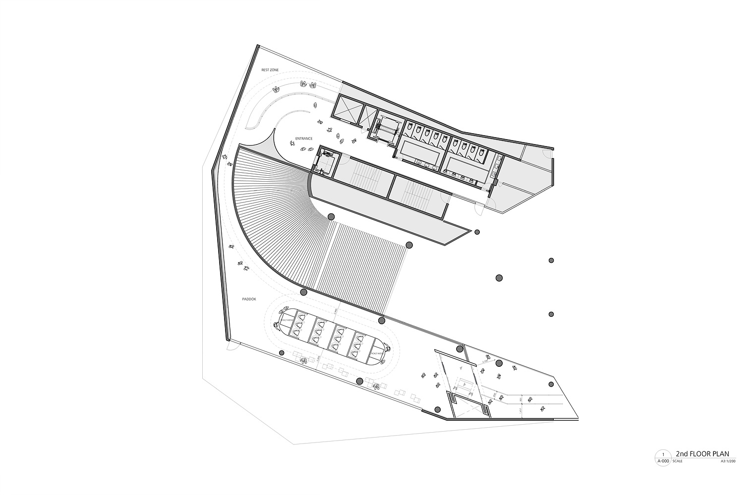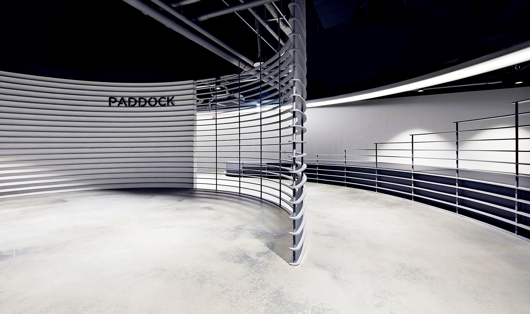 2층 PADDOCK은 마스터 전용라운지로 더 빠른 속도감을 즐기는 마스터 고객들을 위하여 탑승 직전에 느끼는 긴장감이 간접적으로 전달될 수 있도록 실제 레이싱 차량에 적용된 전용 시트가 설치된 시뮬레이션 휴게공간을 구성하였다. 천정에는 트랙을 연상시키는 형태의 라인 라이팅 구조물을 설치하여 속도감을 표현하고, 마스터 고객이 개인별로 기록에 대한 랭킹 및 메모리얼 데이터를 볼 수 있는 미디어 장치를 설치하여 VIP 고객들을 위한 ‘Race981’ 안의 차별화 된 공간을 만들고자 했다.