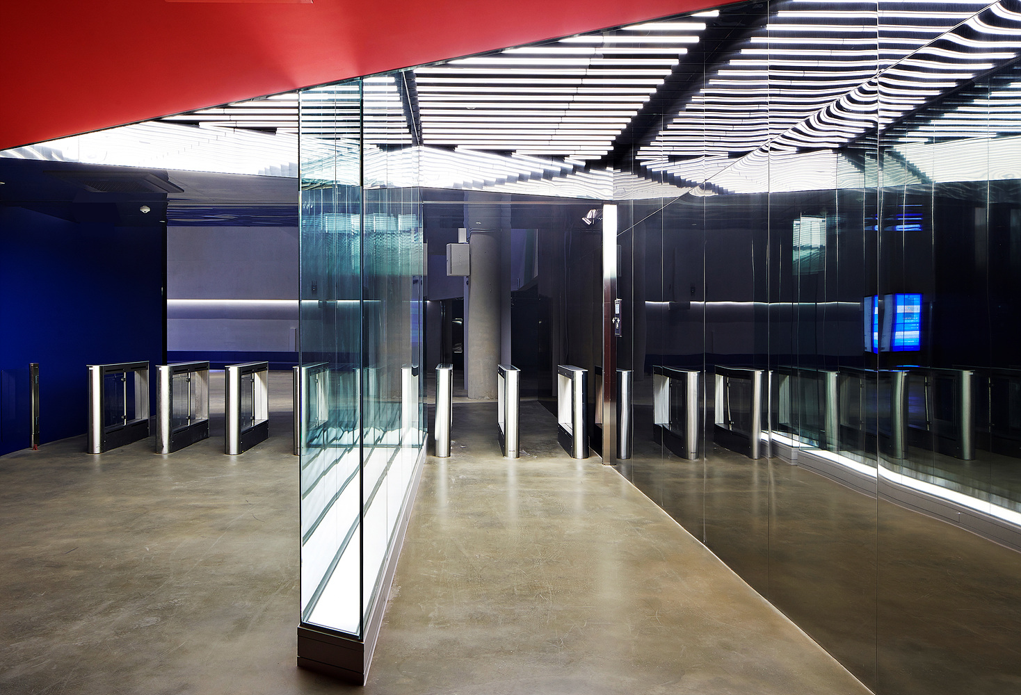 The check-in gate, which taps the wearable for racing, is designed with the concept of transitioning from daily life to fun space to give a feeling that transcends time and space. As soon as passing through the check-in gate, the open space realized an overscale box that seemed to be sucked in using strong reflective materials, and a three-dimensional space was created by turning the walls inside the box at various angles using color pattern lighting and contrasting colors. In addition, the straight, diagonal ceiling design was planned for the purpose of guiding direct guidance