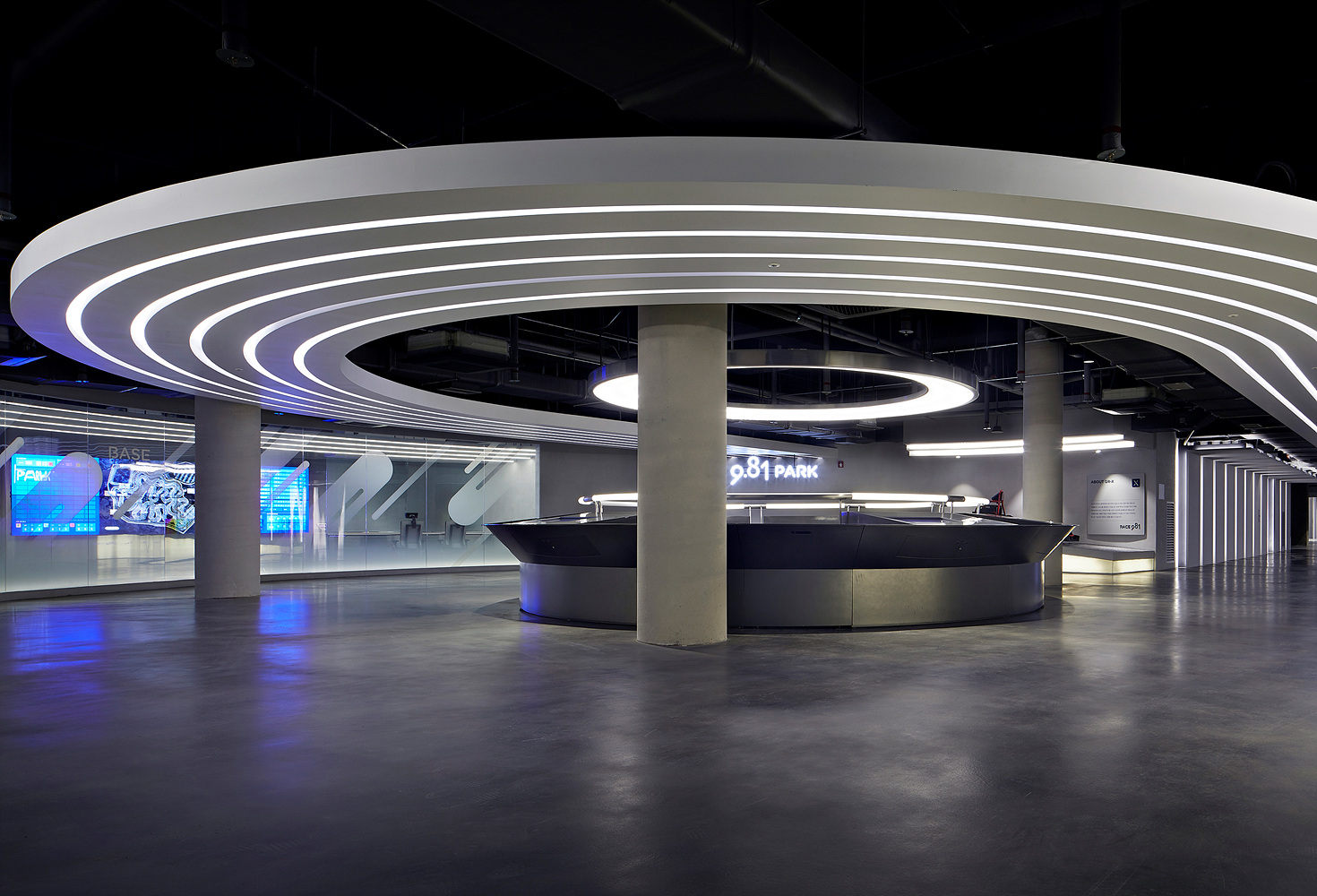 The third floor is a space where all customers experience, and a structural form that separates three courses and a device that allows a large number of people to watch safety education videos at the same time was essential. The shape of the structure was inspired by the brand pattern and the pipe used in the vehicle, and the capsule shape was produced as a motif, and the brand color was designated for each course so that customers could easily recognize it. The space efficiency was maximized by installing a beam projector that can be projected as a single focus on a large capsule-shaped translucent glass wall surrounding a circular column that is structured inside the indoor space. The form of barisol lighting applied to the space and the streamlined band structure are symbolic elements of the 9.81 Park identity to express infinite scalability.