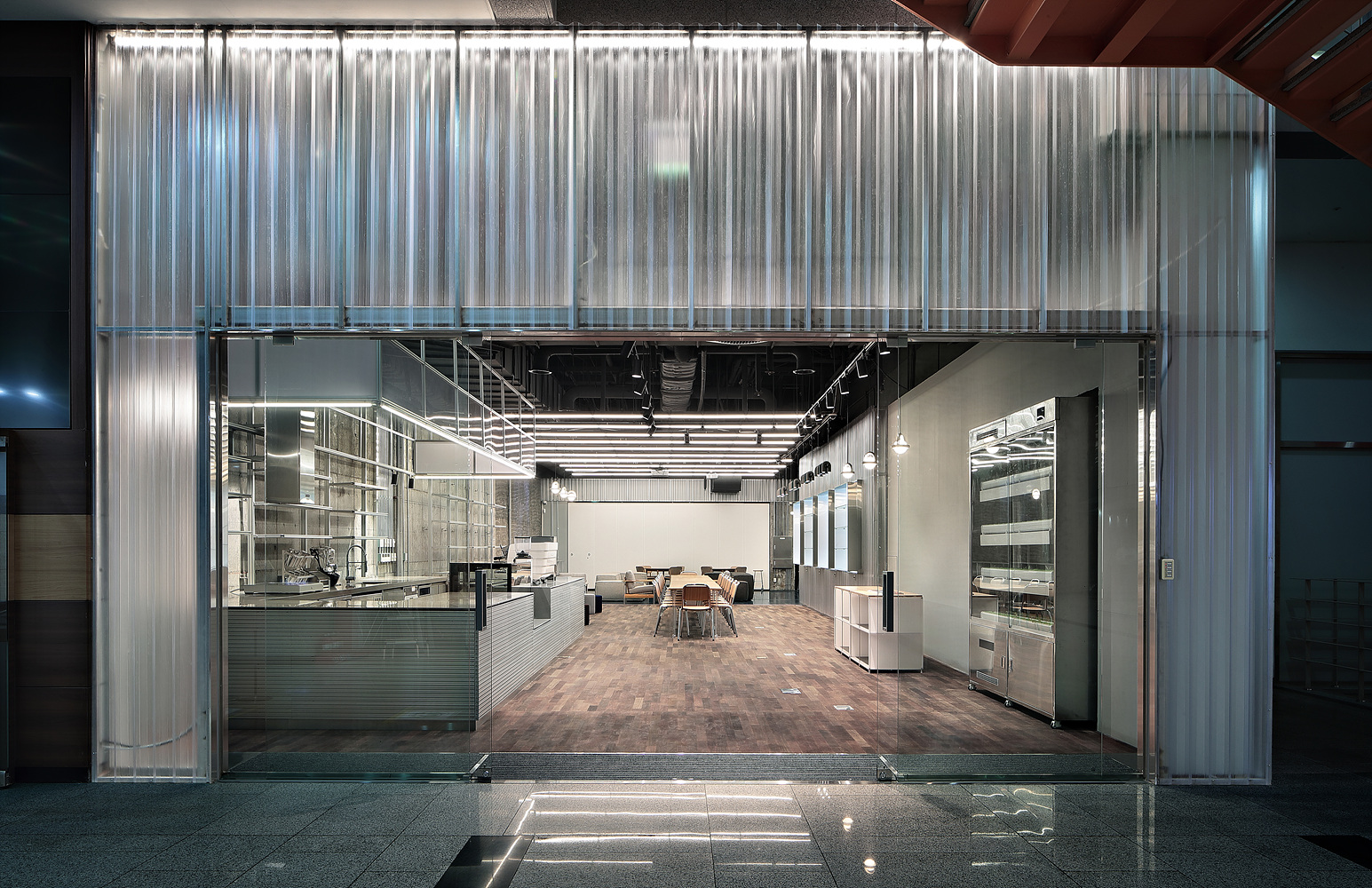 외부 파사드는 주출입구에서 먼 단점을 보완하고 많은 사람들이 접근 할 수 있도록 인지성과 주목성을 높이는데 집중했습니다. 조명투과율이 높은 반투명 소재 POLY-U를 사용한 파사드와 기존 프레임 창호는 최대규격의 통창으로 변경하여 내부공간이 자연스럽게 노출 될 수 있도록 디자인 했습니다.