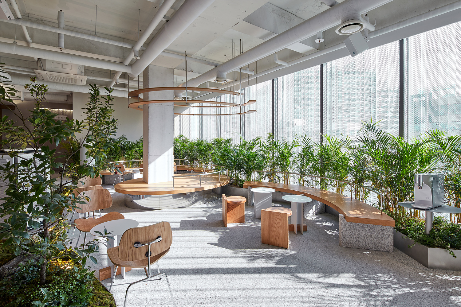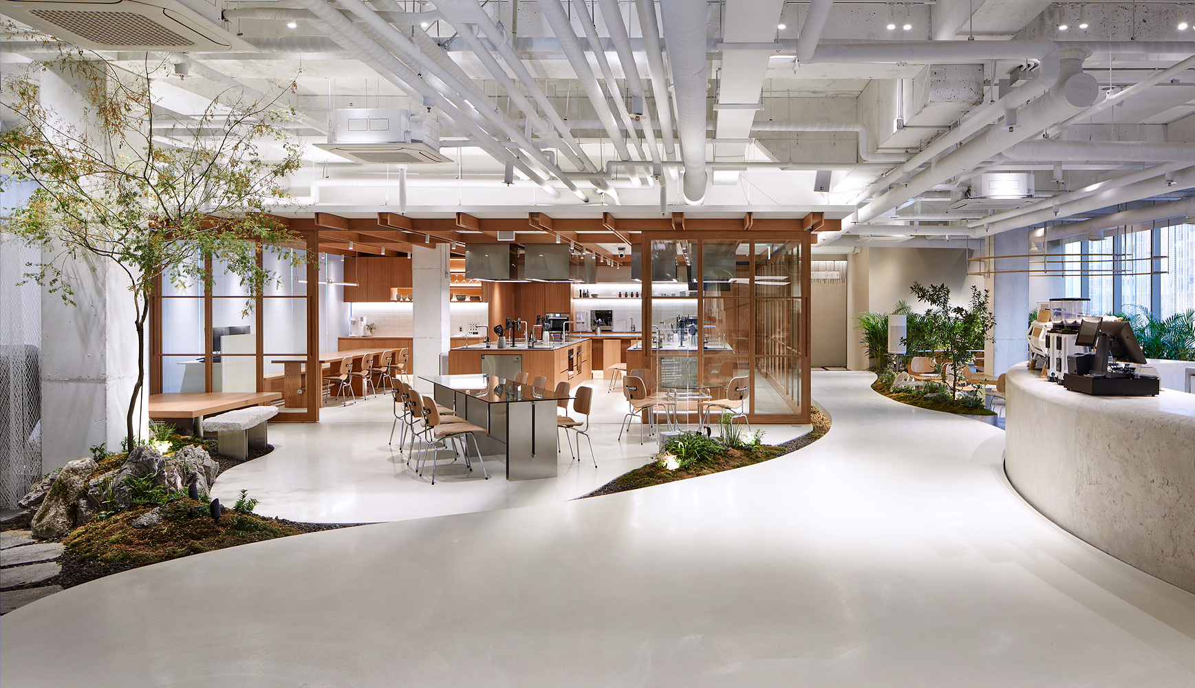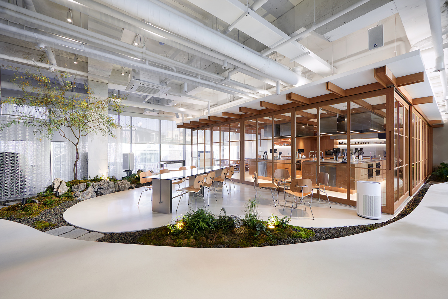 As it is the most active space for solidarity, it gave a warm atmosphere using patterned wood and installed an open-close door to create a private atmosphere while connecting to the Gildong Lounge according to the purpose. Overall space is giving clean and refining atmosphere with heavy off-white concrete and coating finishes but designed in various ways by extending material spectrums in the classes and seats of café, where customers will stay. Above all, the stainless steel "direct water pipe" in the direct water purifier, a product of SK Magic, was brought as an element of spatial design, and the heterogeneous material, Wood, was compromised in a structural and simple way to configure the smart image of the magic product line.