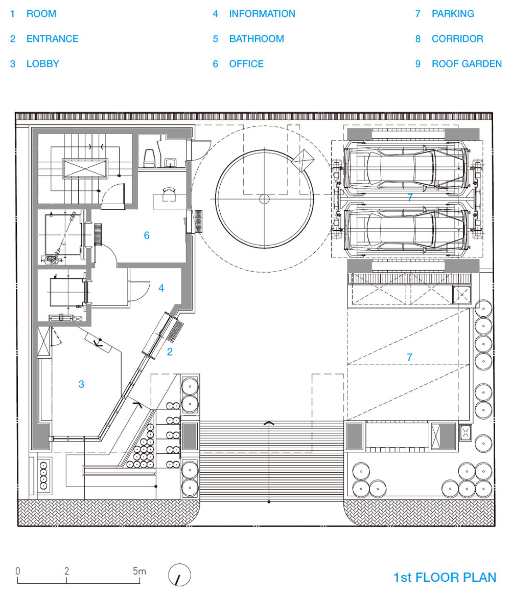 The way to enter a little lower from the access road gives the impression of entering a private and private space. The ramp for the disabled is designed to remind the landscaping and a small alleyway along with the stairs. In the lobby, the slab level difference once again gives the feeling of being in a space different from the space you feel when standing in front of the reception. This level difference is an attempt to maximize the feeling of a space where the entire room 1, located in the upper part of the lobby, is lowered with slabs from the entire floor and entered the room. Although there are only four rooms on each floor, when you open the door from the hallway, the bed is not visible and faces the balcony space of each room. With the balcony space in the middle, one side is a bedroom space and the other side is a bathroom space, so ventilation and light can be provided through the balcony space. This attempt is a spatial device unique to Hotel April that allows guests to be free in the areas of ventilation and light while protecting the privacy of guests through the balcony space that screens the eyes from the outside. The height of the second floor could be secured up to 5m due to the maximum height limit of Gangnam-gu just before the start of construction. Therefore, it was planned as a full-fledged spa space or a space where you can drink wine, etc. The top floor tried to create an individual rooftop outdoor space, but it was not realized due to circumstances. I was satisfied with creating a specialized room with an exhibition room and a duplex room using the high floor height of the second floor. As an architect who is usually very interested in hotel space, I hope that one day, a true boutique hotel space, a complex cultural space, will be established in Seoul, and I hope that it will be remembered as the April Hotel, the place where I tried to start it.