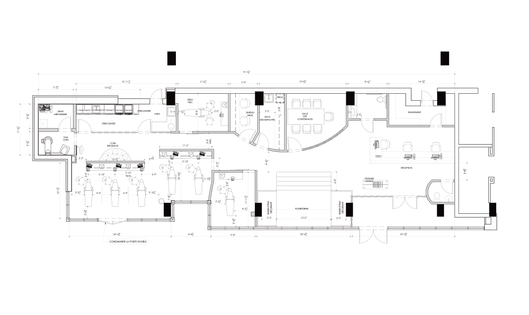 Located in Montreal’s Golden Square Mile on the ground floor of a condominium building, the challenge in building this orthodontic clinic was to bring warmth to this coldly stark concrete - defined space. The idea was not to mask base materials but rather, transform them and create contrast. Surrounding brick buildings in this downtown area are referenced through the custom communal sink made of red demolition brick. This brick is also symbolic of the material of the original location of the doctors’ clinic in the Drummond Medical Building.