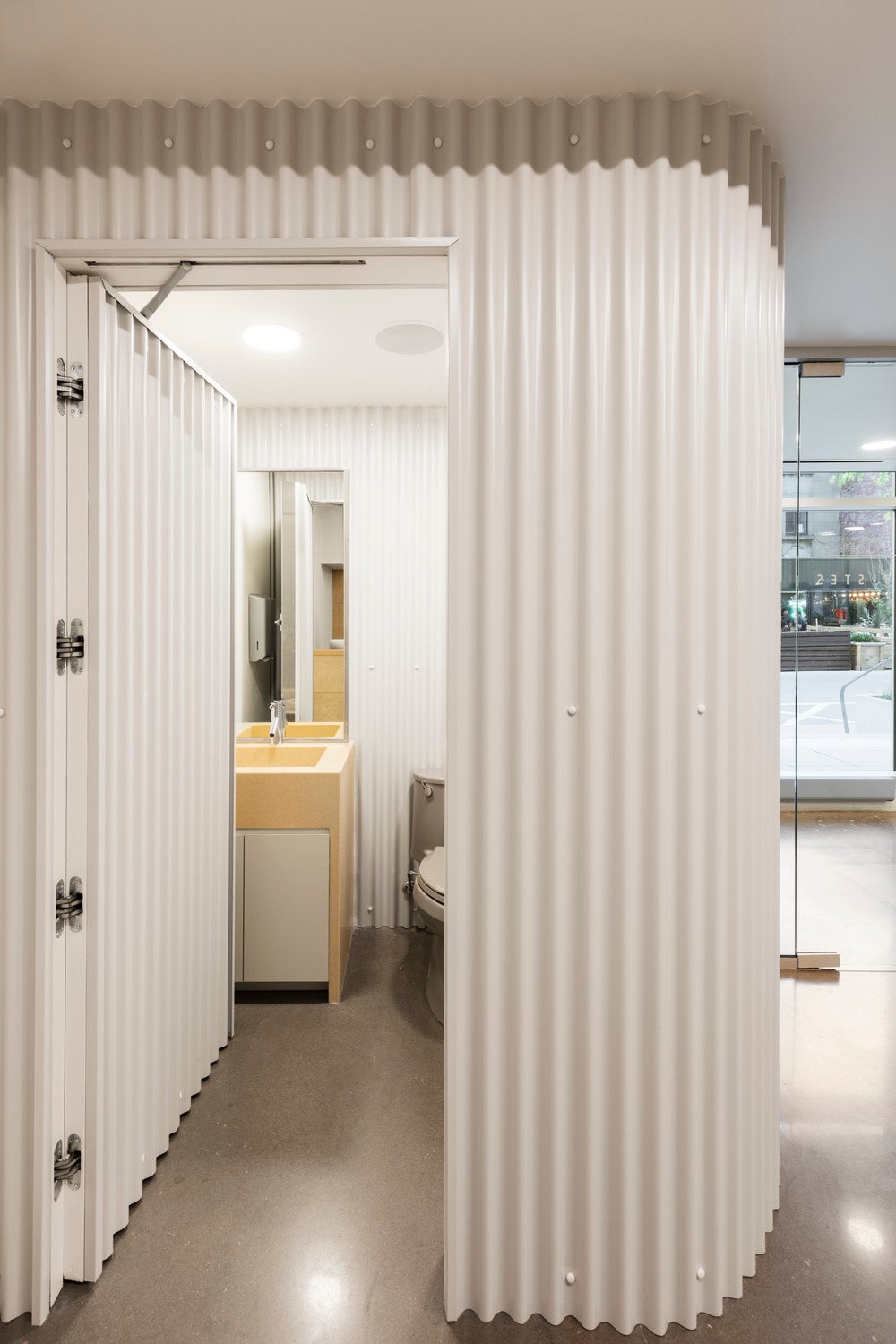 Custom furniture is found throughout the office space making up the majority of pieces in the office. They were designed with durability and hygiene in mind, which drove the decision to work with materials such as powder coated metal, polished concrete and Corian. This includes the custom curved smoky glass closet which is designed as a mobile furniture piece with hidden casters allowing users to reconfigure the space to their preference. The metal finish on the closet matches the custom elevated waiting room platform. The platform plays host to a trio of custom modular ottomans picking up tones from the floor and allowing for multiple seating configuration. The rection desk and its surroundings in limestone create a monochromatic and textured environment that is immersive and welcoming to visitors as they enter. In the conference room, custom Vicostone quartz and powder coat steel tables exist as a large or two smaller surfaces. The conference room also contains an invisible integrated closet, which recalls the corrugated white steel walls of its room as well as the entrance washroom chamber. A communal toothbrushing station is operated with foot pedals for hands-free use, optimizing function and hygiene.