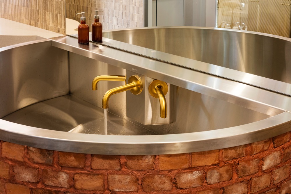 The color was used in order to create a neutral and immersive palette. The array of complementary shades allows for a warm and calming environment for patients and staff. All color choices were made to serve the harmony of the space, as well as adding depth and complexity. By bringing in noble materials, a timeless space is created. The multitude of surfaces covered in individually hand-laid marble mosaic tiles epitomizes the calming effect created by subtle color variation over large surfaces of the repeated pattern. Accents of gold are continuously found in areas such as the retractable curtains in the open clinic as well as door frames, wall partitions and faucets. The multileveled custom gold mesh ceiling emphasizes height and lets the environment breathe upward with a light-catching quality. The bright gold of the waiting room platform, reflecting in the basin beneath creates color in motion.