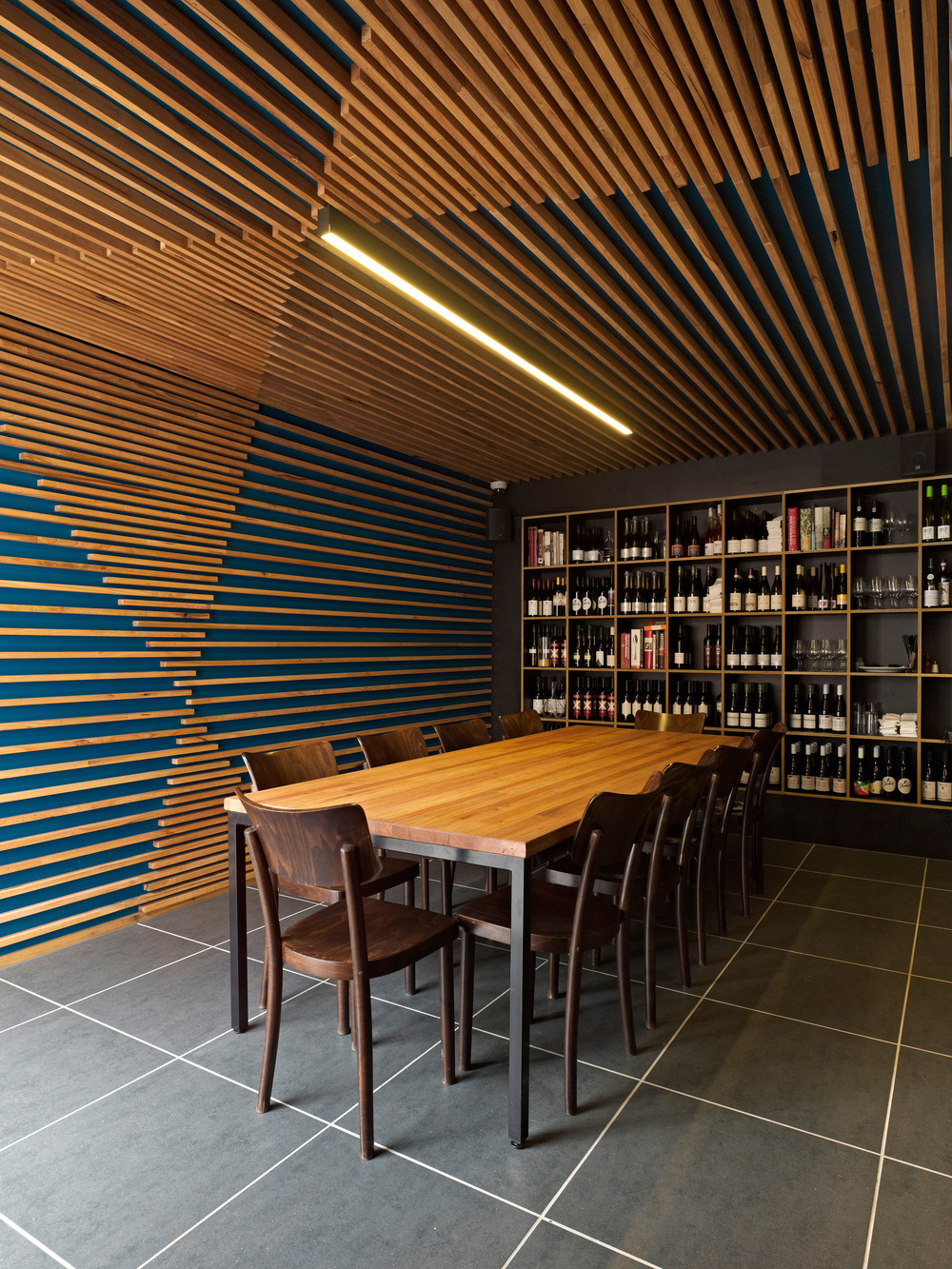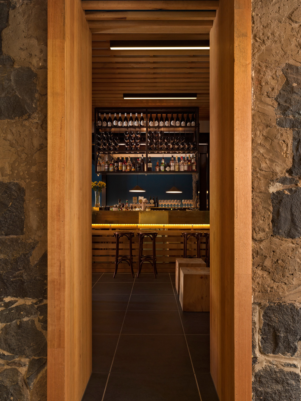In close collaboration with clients Adam Ferrante (Rose St Artists Market) and Mark Grixti (The European / Supper Club) architects SMLWRLD set out to discover a new relationship between the dining spaces and what is consumed within them. This search lead to the image of a French wine press, a rough crucible refining valuable contents, an inspiration that translated into detailed timber expressions of gentle force, careful layering of colour and depth of texture. Material choices focused on the combined warmth of timber and burnished brass, elsewhere blackened steel indicates structural changes made in the spirit of a Victorian industrial history. Woven through the network of intimate and connected dining spaces, blue surfaces create a circling moat that separates old from new, privileging the history of this unique Melbourne building.