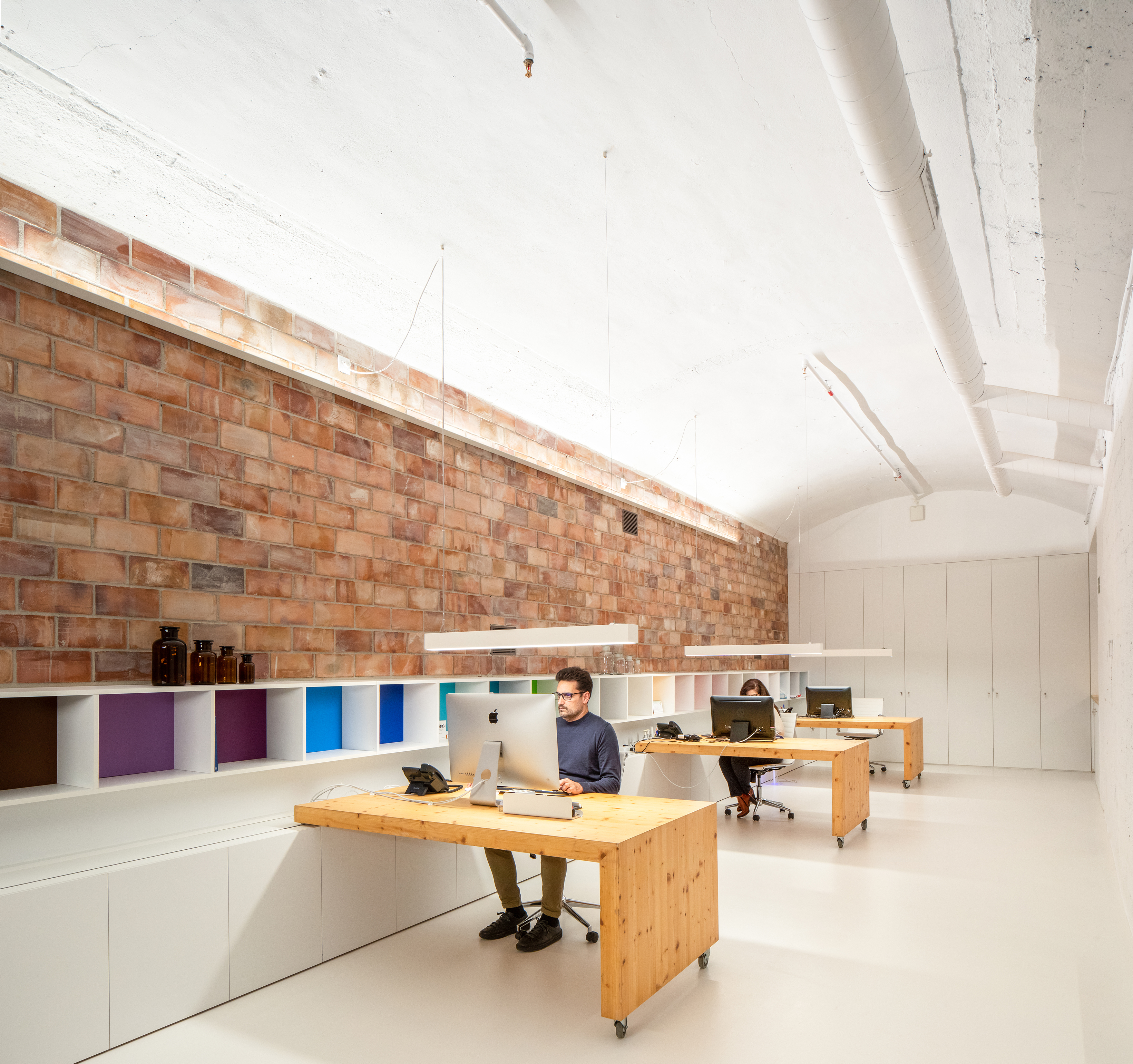 In the ground floor and basement of a corner building built in 1904, between Comerç and Ribera streets, we find the new headquarters of the dermatological company. Taking into account the company has a strong committment with the training of its employees and representatives the headquarters were in need of a training area. The ground floor with access from the street is distributed between two scopes, the hall and these formation area. The divisions between the spaces are conceived as containing walls of habitable furniture, harboring the necessary program and installations. On the other hand, three adjacent rectangular floor vaults made of ceramic brick conform the basement floor. This basement floor is thought from the idea of having again the original visual connections across a great central space with a large table. where habitually the main business activity resides as well as intersections and interactions of the daily company routine. The other two vaults are distributed parallel, and from every point of view, makes it possible to recognize the entire basement in its whole dimension. Both the original structure and the rediscovered materials had been considered in the rehabilitation of this local, enhancing the preexisting space conditions and the heritage gathered over time. Rehabiting the space is the main intention of the project, from the beginning three premises had been taken into account respecting the existing: Recovering + Re-using + Re-lighting